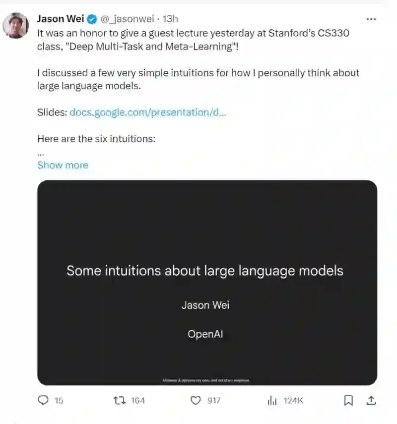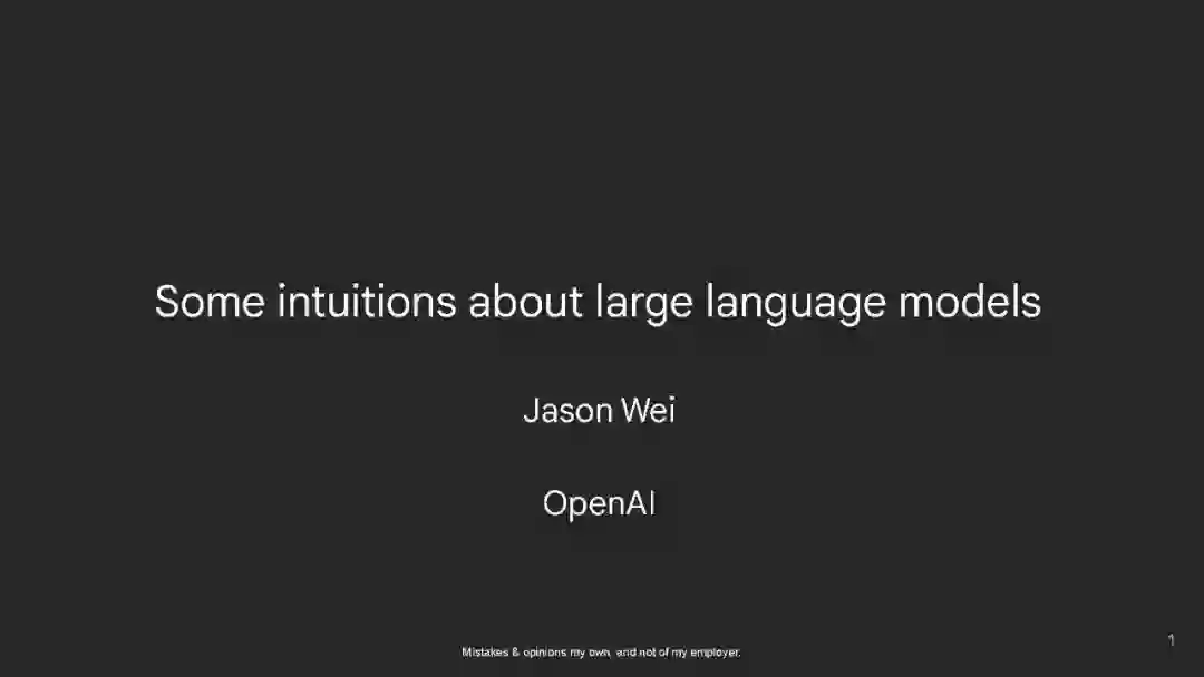 Open AI Jasonwei 在斯坦福大学的CS330课程,"深度多任务与元学习"上做客座讲座!讲述了一些关于如何理解大型语言模型的非常简单的直觉。