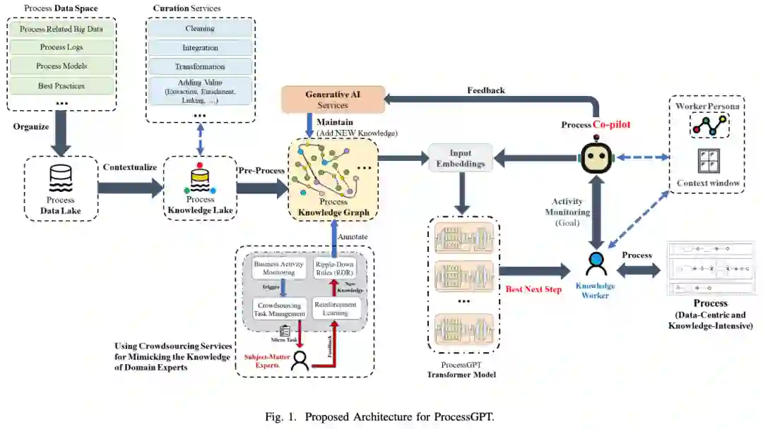 ProcessGPT的架构如图所示,包括流程数据空间、流程数据湖、流程知识湖、流程知识、流程知识图、Transformer模型和Process Co-pilot。