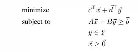 假设一个问题分两个或多个阶段发生,后面阶段的决策取决于前面阶段的结果。第一次尝试对第一阶段的问题进行决策时,事先不知道关于后面阶段决策的最优性。第一阶段的决策是主问题,而后续阶段被视为独立的子问题,其信息被传递回主问题。如果检测到任何违反子问题约束的情况,该约束将被添加到主问题中,然后被解决。主问题代表了一个初始的凸集,它被从子问题中收集到的信息进一步约束,因此随着信息的增加,可行空间会缩小。如果矩阵A和B代表约束条件,Y代的可行集,我们要解决的问题被表示为最小化问题,如下所示: