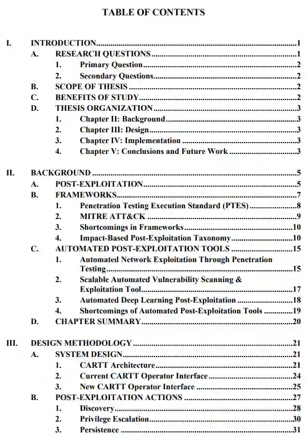 第三章介绍了CARTT是如何扩展到包括自动后开发的。这项研究利用了CARTT客户-服务器架构的集中化和模块化来扩展后开发行动。本章还详细讨论了发现、持续、特权升级和横向移动等后剥削行动。