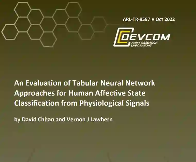 在这份报告中,我们描述了我们对表格神经网络方法进行评估的初步结果,该方法使用可穿戴生理传感器技术,如心电图(ECG)和皮肤电化学反应(GSR)进行人类情感状态分类(如压力、唤醒)。情感状态分类是人机交互(HCI)界日益关注的领域,因为模拟和预测人类情感状态的能力开辟了新的研究方向,侧重于改善人类与自主智能系统的互动和团队。
