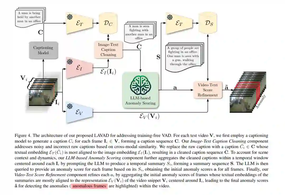 视频异常检测(VAD)旨在视频中临时定位异常事件。现有工作大多依赖于训练深度模型学习正常性的分布,无论是通过视频级监督、单类监督,还是在无监督设置中。基于训练的方法倾向于是领域特定的,因此对于实际部署而言成本高昂,因为任何领域的变化都将涉及数据收集和模型训练。在本文中,我们从根本上脱离之前的努力,提出了一种基于语言的VAD(LAVAD)方法,这是一种新颖的、无需训练的范式,利用了预训练的大型语言模型(LLMs)和现有的视觉-语言模型(VLMs)。我们利用基于VLM的字幕模型为任何测试视频的每一帧生成文本描述。有了文本场景描述,我们然后设计了一个提示机制,以解锁LLMs在时间聚合和异常评分估计方面的能力,将LLMs转变为一个有效的视频异常检测器。我们进一步利用模态对齐的VLMs,并提出了基于跨模态相似性的有效技术,用于清理噪声字幕和优化LLM-based的异常分数。我们在两个大型数据集上评估了LAVAD,这些数据集展示了现实世界中的监控场景(UCF-Crime和XD-Violence),显示它在不需要任何训练或数据收集的情况下,就超过了无监督和单类方法。