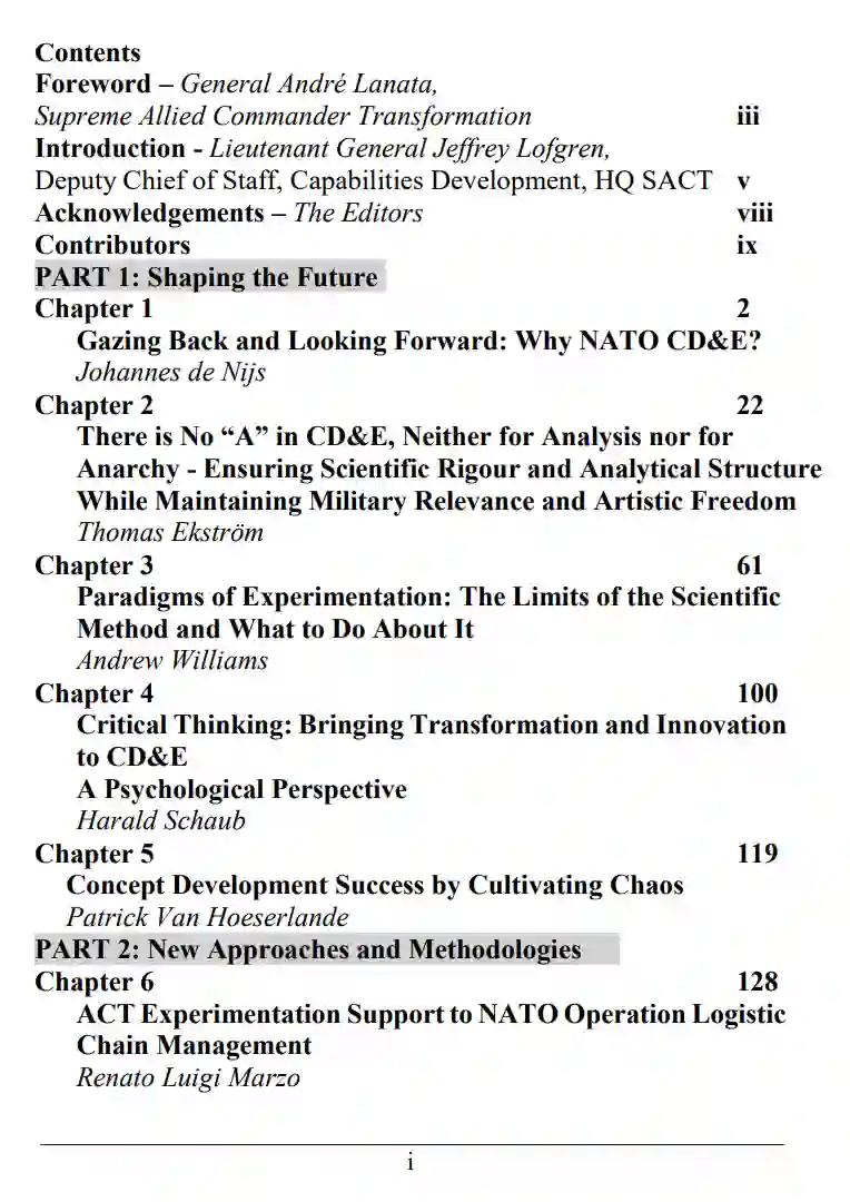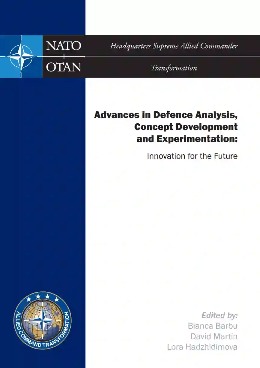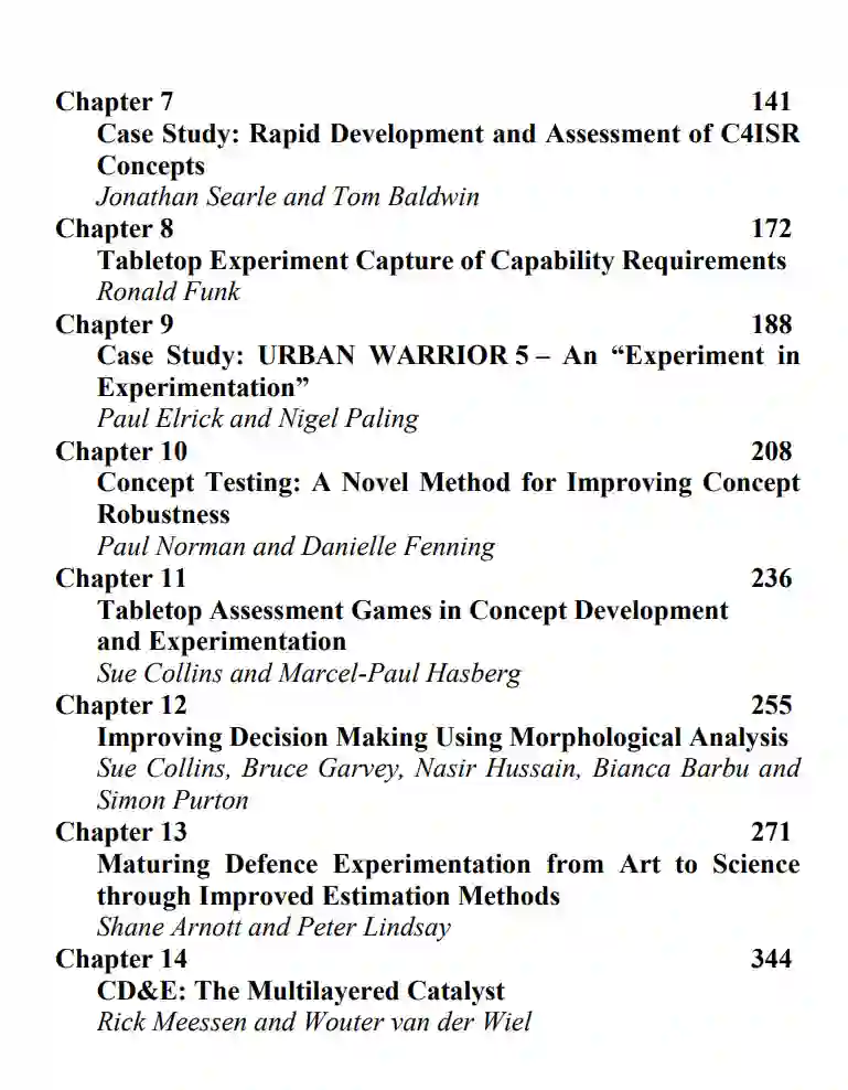 随后,介绍了各种技术和分析方法。向读者介绍了桌面实验(TTE)的适用性和有用性,解释了它们的结构、目标以及它们在特定的军事和科学背景下确定能力要求的总体效果。埃里克先生和帕林博士的章节通过介绍英国 "城市战士5号 "实验的具体情况,强调了单个模拟设计的优势和劣势,对桌面实验中使用的测试和方法这一主题做出了贡献。介绍了概念测试方法,并强调其重要性、广泛的适用性,并概述了构成概念测试成功过程的主要特征。补充了概念测试和桌面实验的重要性,强调了CD&E过程和三种不同类型的桌面评估游戏的价值:"能力评估游戏"、"颠覆性技术评估游戏"、"概念发展评估游戏"。着重介绍了形态分析克服传统简化系统所具有的弱点,为国防决策带来的优点。强调了对CD&E进行更多实证研究的必要性,这将填补文献中存在的空白。此外,这些研究提供了一种被称为 "防御估计成本模型 "的方法,实验中的专业人士可以在不同部门的分析中使用。