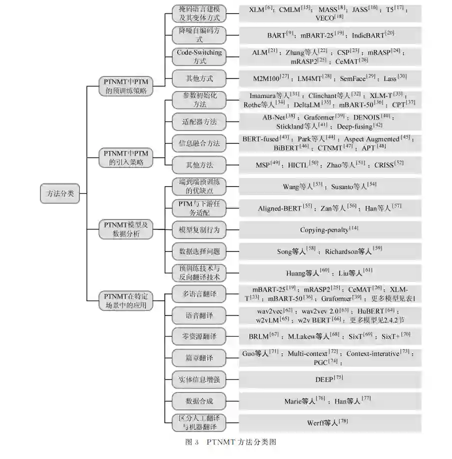 机器翻译是自然语言处理领域中一个重要的研 究方向,其主要实现的功能是将源语言翻译成目标语 言。近年来,随着深度学习技术在人工智能领域的发 展,神 经 机 器 翻 译 (Neural Machine Translation, NMT)已经 成 为 机 器 翻 译 方 向 中 的 主 流 方 法。从 2013年发 展 至 今,研 究 人 员 提 出 许 多 模 型 来 实 现 NMT,例如,CNN [1]、RNN [2]、Transformer [3]等,最终 基于自注意力网络设计的 Transformer成为了 NMT 的主流范式[4]。 Transformer的出现,不 仅 带 动 了 NMT 的 发 展,也带动了整个自然语言处理领域的发展。其中, 受 Transformer 影 响 出 现 的 大 规 模 预 训 练 模 型 (Pre-TrainedModel,PTM)在许多自然语言处理任务上都取得了先进的性能。大量工作表明[5-9],在大 规模无标签数据上训练的 PTM 可以学习到“通用 表示知识”,这使 PTM 拥有强大的语言理解和生成 能力。PTM 的“通用表示知识”也引起了机器翻译 研究人员的关注,研究人员期望通过引入 PTM 来 提高 NMT 的性能。这种将 PTM 引入 NMT 的方 法被称为预训练神经机器翻译(Pre-trainedNeural MachineTranslation,PTNMT)。 与不引入 PTM 的 NMT 相 比,PTNMT 的 优 势可以总结为以下几点: (1)PTM 可以使 NMT 模型很好地利用无标 签数据; (2)PTM 可以提高 NMT 模型的泛化能力和 鲁棒性; (3)PTM 可 以 帮 助 NMT 搭 建 通 用 的 翻 译 模型。 当前,PTNMT 存在大量的工作,但尚不存在独 立地对其进行总结的综述文章,已有的 PTNMT 相 关整理工作都是以一节的形式出现在 PTM 综述文 章里。一部分工作[10-11]仅简单地对 PTNMT 进行 介绍,另一部分工作[12]则是从单语言和多语言角度 对 PTNMT 的部分工作进行分类说明。虽然也存 在对PTNMT 整体发展进行描述的报告[13],但这些 工作都缺少对 PTNMT 相关工作的系统性整理和 分析。本文主要以 PTNMT 的构建、问题分析和应 用为切入点,对相关工作进行详细的分类,侧重于对 不同方法进行对比,涵盖了最新的相关工作,分析了 PTNMT 的优缺点及其对其他任务的启发,首次完 成对 PTNMT 相关工作的系统性整理和分析工作。 本文组织结构如下:第 1 节简单介绍 NMT、 PTM 和 PTNMT 的背景;第2节介绍 PTNMT 相 关工作的分类对比;第3节总结 PTNMT 的优缺点 并进行相关分析;第4节对 PTNMT 研究的未来进 行展望;第5节总结本文内容。