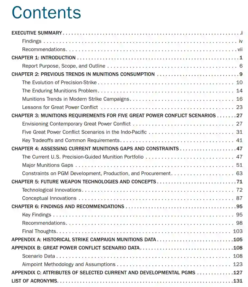 本专著通过跟踪精确打击的演变和探索美军在大国冲突中最紧迫的弹药需求来得出这些结论。最重要的是,它强调了美国可能利用创新技术和概念来克服其现有的PGM组合的能力和能力缺陷,并扩大其弹药工业基础。分析从考察历史上的打击行动开始,然后对美国和中国在印度-太平洋地区的潜在冲突情况进行前瞻性评估。自海湾战争以来三十年的精确打击行动表明,尽管使用PGM获得了巨大的有效性优势,但美军在针对地区和非国家对手的有限战役中,这些武器的库存却一再低得惊人。即使目前在美军中PGM无处不在,大国对手的广阔地域、众多目标和密集的防御意味着今天的全面打击行动将需要大量的PGM开支--美国军队可能难以提供。