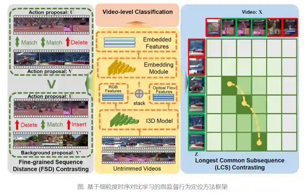目前,弱监督视频行为定位方法主要遵循于通过优化视频级分类目标来实现定位的方式。这些方法大多忽略了视频之间丰富的时序对比关系,因此在分类学习和分类-定位自适应的过程中面临着极大的模糊性。本文认为通过考虑上下文的序列到序列对比可以为弱监督时序行为定位提供本质的归纳偏置并帮助识别连续的行为片段。因此,如图1所示,本文在一个可导的动态规划框架下,设计了包括细粒度序列距离对比和最长公共子序列对比在内的两个互补的对比目标函数。在多个主流的基准数据集上的实验结果表明本文方法取得了显著的效果。