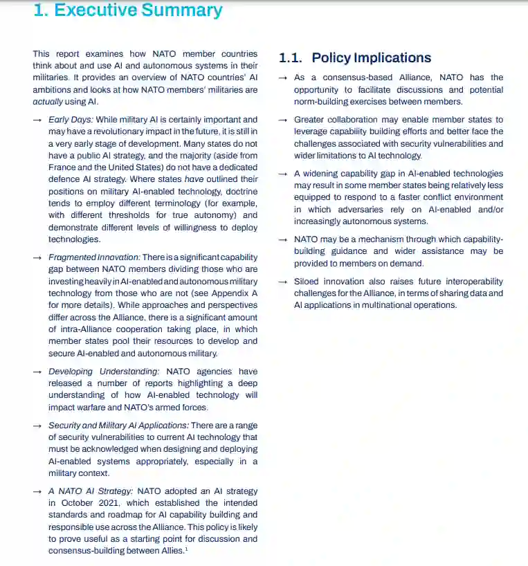 该报告概述了每个北约国家在军事人工智能方面的观点和雄心,并概述了它们目前对人工智能技术的使用。在附录A中,报告探讨了每个国家在军事和国防背景下与人工智能的接触程度,审查了国家人工智能战略和当前人工智能技术使用的公开来源。