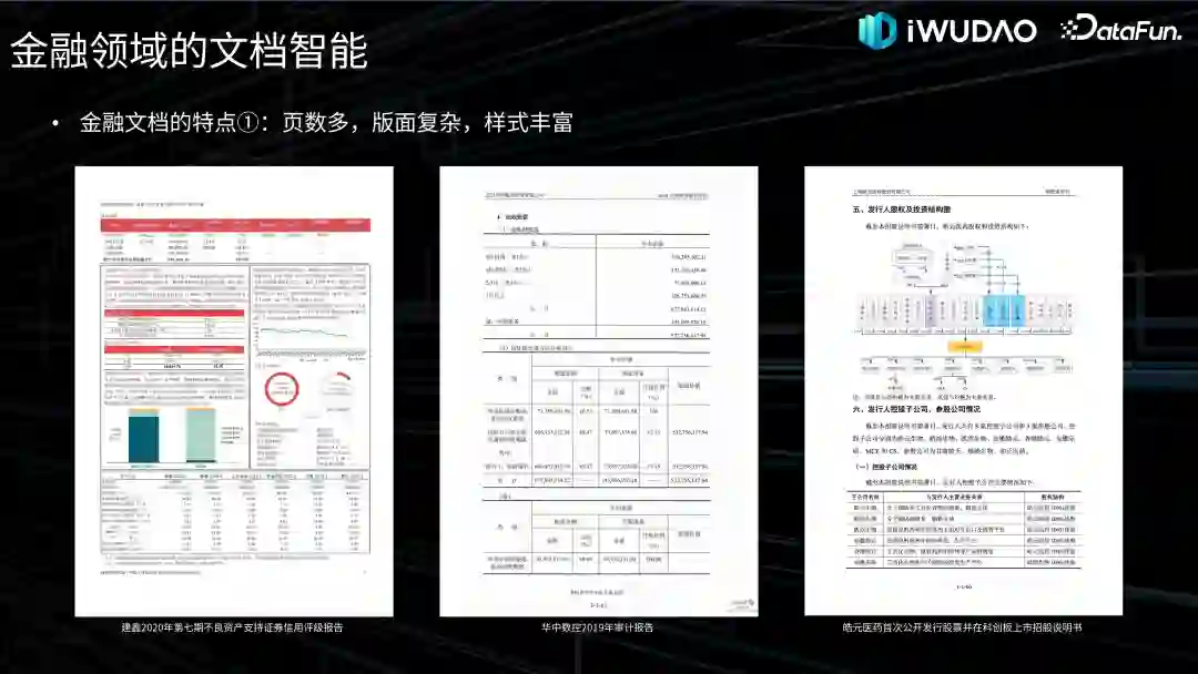 金融行业广泛使用图文并茂的富格式文档,这些文档中蕴含着丰富的高价值信息资源。与手动处理方式相比,自动化地将这些文档内容转换为结构化数据可以大幅提升处理效率,且极大地便利后续的数据分析和挖掘工作,从而为金融从业者和决策制定者提供更加全面和精确的数据支持。随着深度学习技术的发展,文档智能相关的新技术纷纷涌现,卷积神经网络、循环神经网络、图神经网络、Transformer 等技术的发展使得复杂版面的文档分析与识别实现性能突破,受益于多模态融合、大模型等技术的提出,很多以前不可能做到的文档深度理解场景已经成为可能。上图中列出了常见的金融文档类型,这些文档里面包含了大量有价值的信息,比如审计报告里的财务数据、募集说明书和招股说明书里的历史沿革等,可以很好地反映一个公司的经营状况和发展历史。那么如何快速处理海量富格式文档,从中精准定位并抽取有用的信息,从而构建知识图谱、进行数据分析或用户交互,对于金融领域的文档智能是很大的挑战。