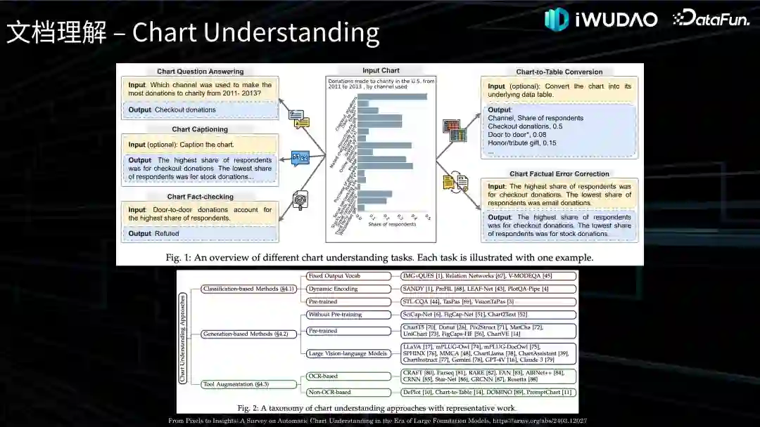 随着大模型技术的不断发展,很多以前无法自动化处理的任务都成为了可能,比如如图所示的一些 Chart Understanding 领域的工作,将图表转化成结构化数据,之前没有太关注,现在已经有大模型产品比如 GPT4V、Claude 提供类似的功能。随着LVLMs(Large Vision Language Models)的持续发展,Chart Understanding 的各项任务都取得了变革性的突破,SOTA 基本都是被基于预训练模型和 LVLM 所刷新的。