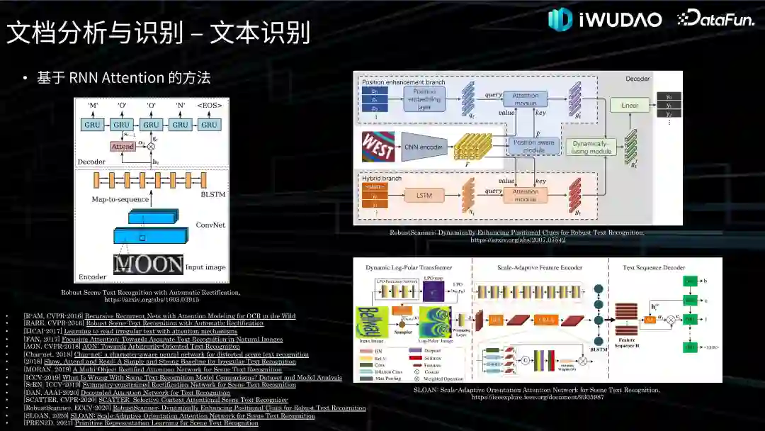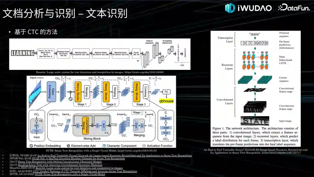 首先讲一下基于 CTC 的方法,CTC 方法的优势在于无需进行单字符切分,也无需文本标注和模型输入的对齐信息,即可学习到二者的隐式对齐信息。最著名的工作是华科白翔老师团队在 TRAMI-2016 上发表的工作 CRNN,如右图所示,该方法将文本识别任务视为序列识别任务,在多种不同场景下都展现了不错的性能。从 CRNN 以后,基于 CNN + RNN + CTC 的文本识别方法成为文本识别领域的主流方法之一。有句话这么讲,比 CRNN 速度快的性能没它好,比 CRNN 性能好的速度没它快,因此该方法在发布后的很多年里在工业界极具竞争力。此外,Facebook 在 KDD-2018 上发表的 Rosetta 也是一个基于 CTC 的工作,商汤在 AAAI-2020 上发表的 GTC 提出使用注意力机制来引导 CTC 的训练,并使用图卷积网络来发挥 CTC 解码器的潜力。百度 Paddle 在 IJCAI-2022 上出品的 SVTR 摒弃了包含特征模型和序列模型的二阶段算法,仅通过单个视觉模型就完成了特征提取和文本转录这两个任务,既能保证推理速度,又能获得更好的识别效果。