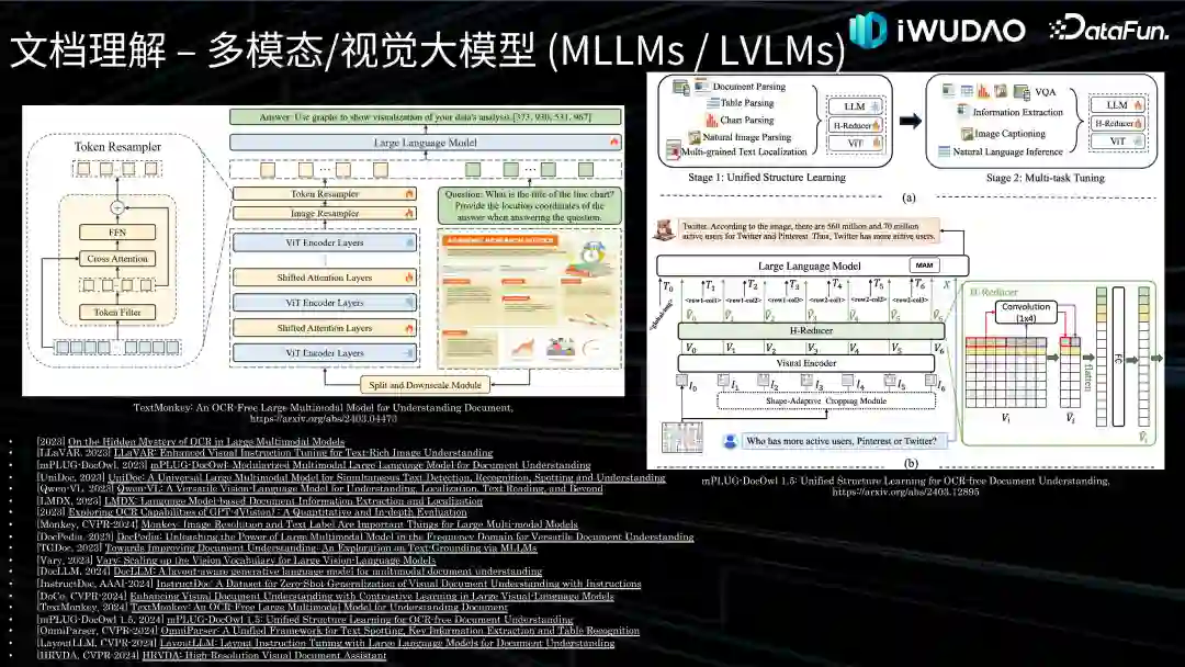 随着 MLLM(多模态大模型)和 LVLM(视觉大模型)的发展,文档理解从去年下半年开始迎来新的范式,很多基于多模态大模型或视觉大模型的文档理解工作开始涌现。这里展示的是今年最新的文档理解模型:华科和金山研究人员在 CVPR-2024 发表的多模态大模型 Monkey 基础上提出的 TextMonkey、阿里的 DocOwl 1.5。