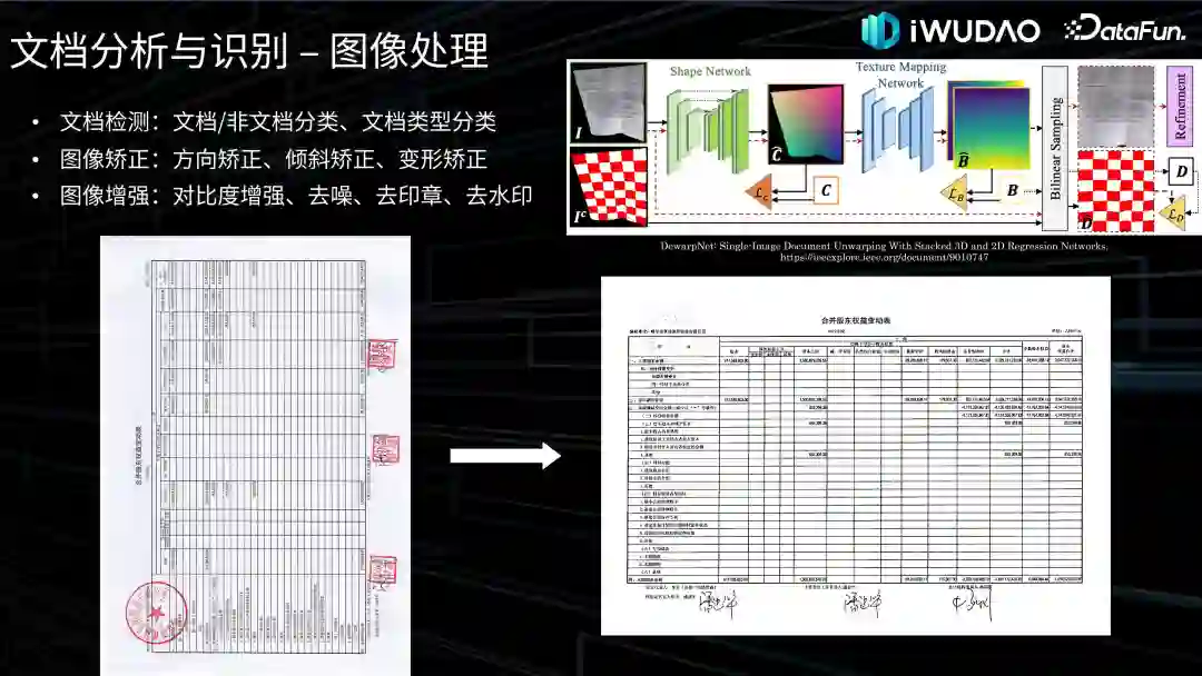 文档图像质量影响后续的版面分析和内容识别效果,而图像质量取决于物理文档形状、成像条件和成像视角等。常见的文档图像预处理工作有:文档检测、图像矫正和图像增强。文档检测是为了判断图像是否是文档页面以及文档的类型。图像矫正的目的是将 90 度旋转或倾斜的页面进行修正,以及还原扭曲变形的纸张。旋转和倾斜是因为纸张放置不正导致的,因此 20 世纪 90 年代以来一些学者开始研究如何矫正,主要采用多方向投影。纸张不平、弯曲、褶皱以及相机视角是造成图像形变的因素,早期基于 3D 重构和 2D 图像处理的矫正方法不具备普适性,近几年基于深度学习形变矫正已成为主流,例如基于预测密集形变场进行矫正的方法,典型的有 ICCV-2019 上的工作 DewarpNet 如右上角所示,通过预测出三维坐标图、形变场和阴影图等来继续更精细的文档矫正,也有一些工作是基于预测稀疏控制点进行矫正的方法,可以减少矫正模型的计算量。图像增强的目的是为了去除页面中阴影、水印等有干扰的噪声,为后续版面分析和内容识别的工作提供支撑。历史文档因纸张陈旧、污损等,图像噪声多,为此提出了一些颜色分离、局部二值化等改进方法来处理文本和背景的分离问题。值得一提的是,因为黑白扫描导致和文字颜色相同的印章去除仍是比较有挑战性的工作。2. 版面分析