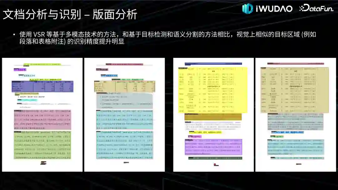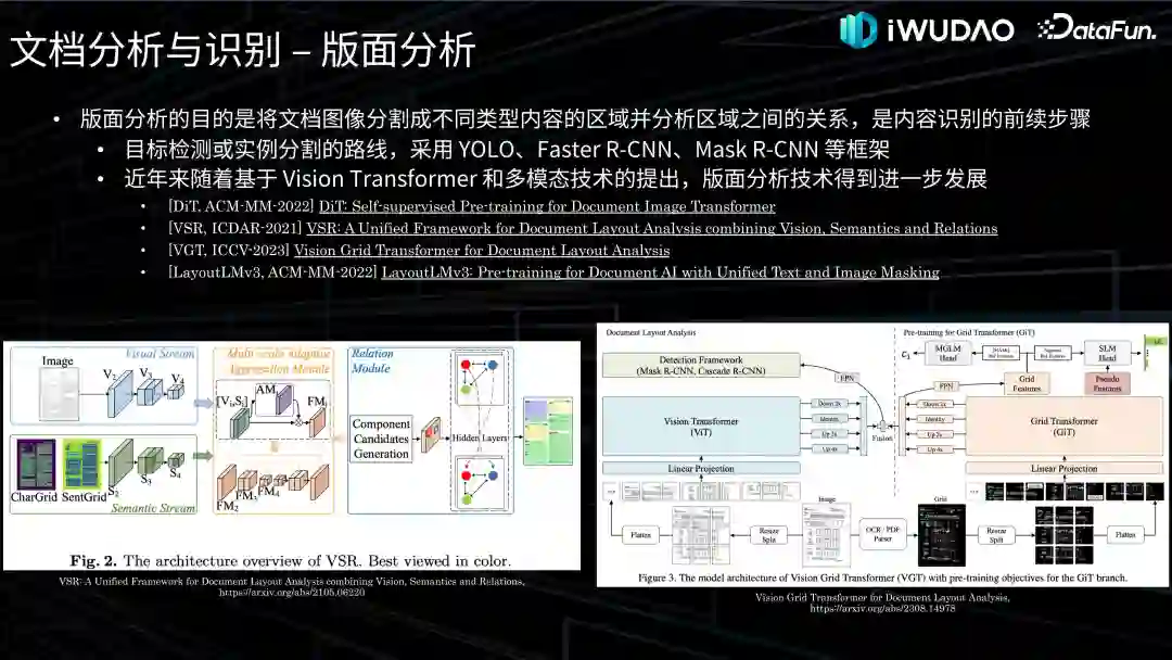 版面分析的目的是将文档图像分割成不同类型内容的区域并分析区域之间的关系,是内容识别之前的关键步骤。一种方式是采用基于目标检测或实例分割的路线,Faster R-CNN、Mask R-CNN 等通用框架被用来对文档图像中的目标区域进行分割。近年来随着基于 Vision Transformer 和多模态技术的提出,版面分析技术得到进一步发展,比如这里贴出的海康威视在 ICDAR-2021 发表的工作 VSR、以及阿里在 ICCV-2023 发表的工作 VGT,都是我们常用的模型,另外,LayoutLM 系列模型除了文档理解任务以外,版面分析也是其工作一个主要任务。