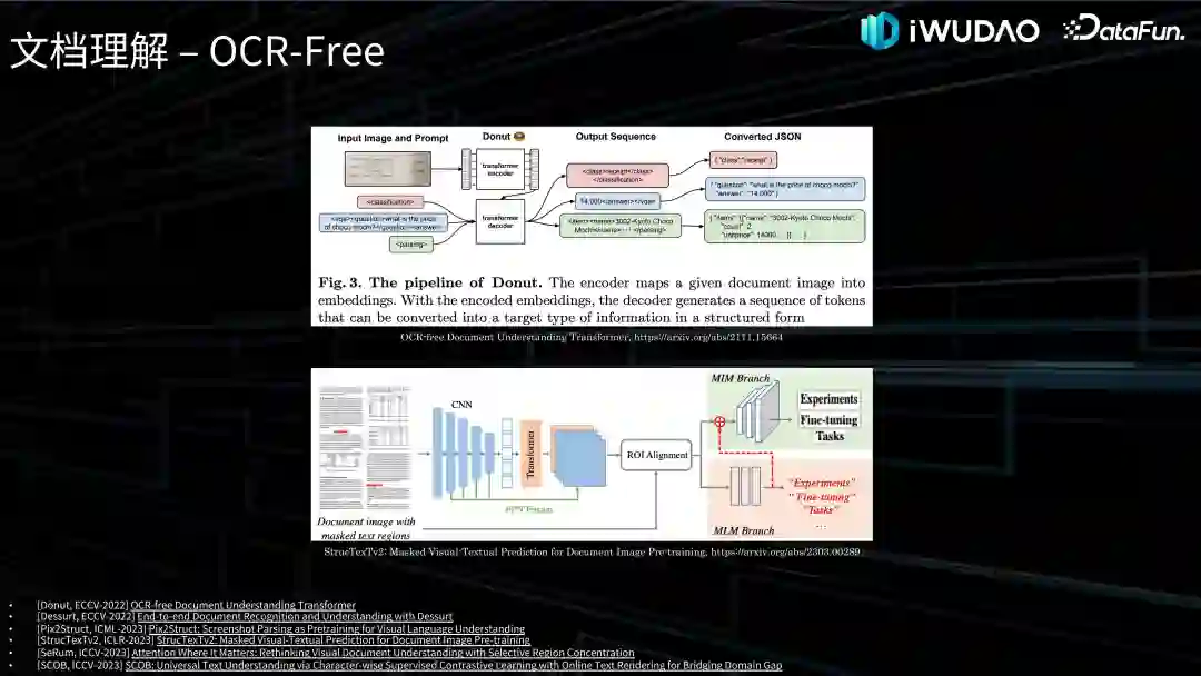 随着大模型把 Transformer Decoder 带入我们的视角,诞生了一种 OCR-Free 的架构,这个做法是把图像直接送进 Transformer Encoder 里,然后直接经过一个 Transformer Decoder 去理解信息,最后通过自回归的方式直接输出信息。这方面最早的工作是 Naver 在 ECCV-2022 发表的工作 Donut,以及百度在 ICLR-2023 的工作 StrucTexTv2。虽然 OCR-Free 的模型非常灵活可以同时做多任务训练,但也存在一个问题就是文字准确率不如前面我们讲的范式,这也是后续研究需要解决的问题。