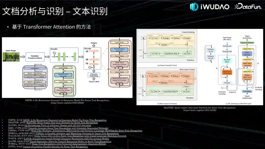 前面提到 RNN Attention 串行解码的方式耗时较多且计算量大,因此很多工作开始使用基于 Transformer 来进行并行化处理,相比 RNN 也可获得更强的语义信息。中科院在 2018 年一项工作 NRTR 使用了完整的 Transformer 结构对输入图片进行编码和解码,如左图所示,只使用了简单的几个卷积层做高层特征提取,在文本识别上验证了 Transformer 结构的有效性。还有 Naver 在 2019 年提出的 SATRN、平安在 2019 年提出的 Master、中科大团队分别在 CVPR-2021 发表的 ABINet 和 ICCV-2021 发表的 VisionLAN 等,都验证了基于 Transformer 方法并行训练的高效性和精度可靠性。