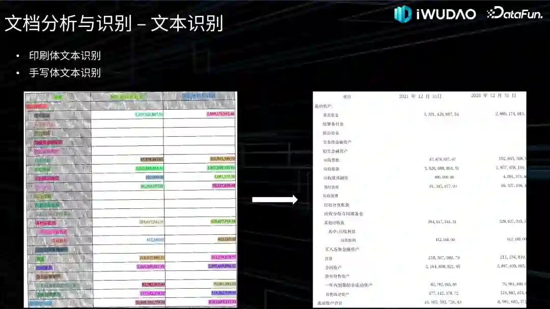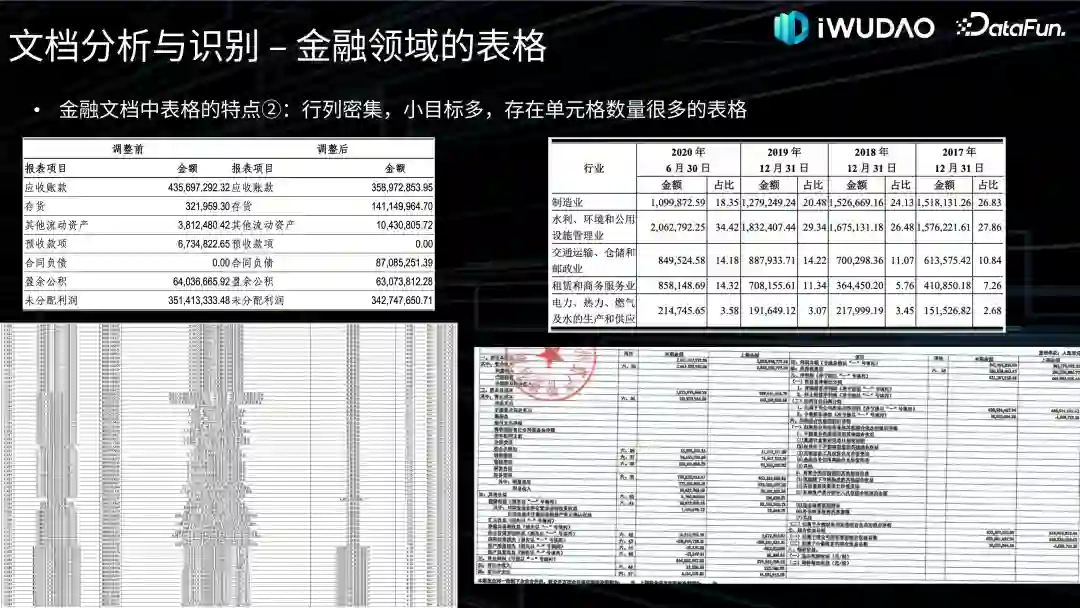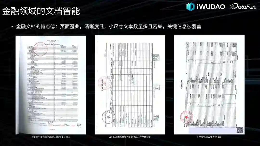 从图像质量的角度来看,金融领域也存在不少歪曲、模糊等低质量画面的文档,尤其是一些拍照扫描材料或年代久远的文档,后面会在图像处理中简述这方面的原因及修复工作。另外,金融文档也常见密集小尺寸的文本对象,如图中的财务报表,往往都是至关重要的数据。再加上印章、水印的干扰,尤其是黑白印章的覆盖,使得后续的内容识别任务相当困难。以上就是金融领域文档智能的特点和面临的挑战。03****
