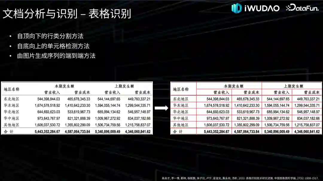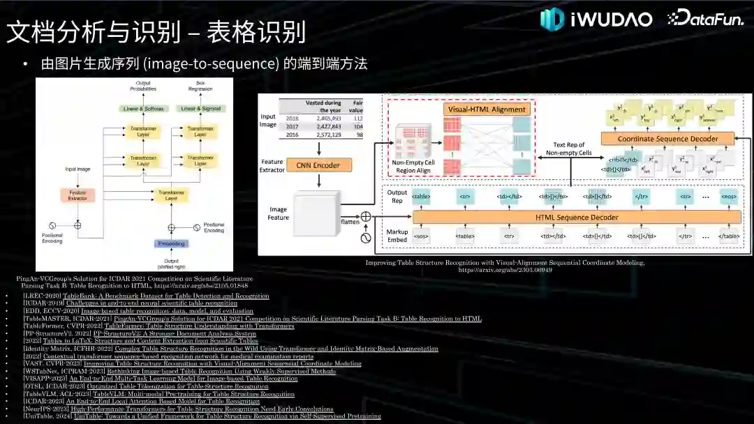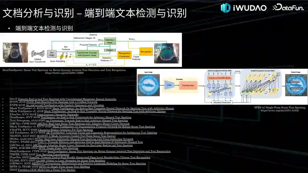 近年来,有些工作将文本检测和识别联合起来考虑,提出了一系列端到端文本检测与识别技术,称为 Text Spotting。基于深度学习的端到端方法大致可以分为两阶段和一阶段两大类方法。两阶段模型中,刘成林老师团队在 ICCV-2019 上发表的 TextDragon 及 Naver 在 ECCV-2020 发表的 CRAFTS,都是基于组件的方式处理不规则文本。华南理工团队的 ABCNet 系列对不规则文本的边界进行几何建模,而华科白翔老师团队的 Mask TextSpotter 系列模型结合上述两种方式的特点,在 Mask R-CNN 检测文本行的基础上加入了单字检测与识别。华南理工金连文老师团队在 CVPR-2022 提出的 SwinTextSpotter 模型可以使识别分支更充分地利用来自检测分支的反馈,提高了端到端文本识别的性能。近年来,考虑到端到端联合训练检测与识别分支时,特征对齐与变换的操作会造成特征的失真,从而给识别带来负面影响,一些学者提出了单阶段的方法,即模型可以在检测文本区域的同时预测文本的内容。深圳码隆科技在 ICCV-2019 提出的 CharNet 是较早提出的方法。海康威视在 AAAI-2021 提出的 MANGO 可根据字符级别的分类结果,并行输出端到端识别结果。CVPR-2022 上发表的 TESTR 设计了双通道解码器,同时输出文本检测框及其对应的文本识别内容。华南理工金连文老师团队和华科白翔老师团队联合发布的 SPTS 模型首次将端到端文本检测和识别任务建模为简洁的序列预测问题,采用基于 Transformer 的序列预测模型将文本检测和识别融为一体。总体来看,近年来此领域涌现出不少基于 Transformer 框架的端到端场景文本识别新方法,是值得关注的发展方向。(2)表格识别接下来介绍内容识别的第二个部分:表格识别。