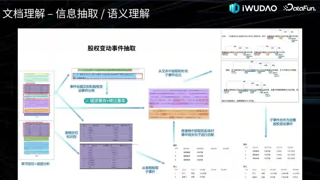 在文档分析与识别工作的基础上,通过信息抽取或语义理解等技术来处理文档理解,此时文档理解作为文档分析与识别的一个重要下游任务。随着大模型的发展,越来越多的信息抽取及语义理解任务被降维替换,但文档分析与识别目前来看依旧可以扮演重要的角色,相对于简单文本行的抽取,一个性能良好的文档分析与识别工具可以为大模型提供带有结构信息的稳定输入,很大程度提高大模型信息抽取的性能。这边的例子是我们关于股权变动事件抽取的工作,首先通过章节定位和版面分析将事件所在的段落和表格筛选出来,然后判断变动事件的类型是增资、减资还是转让,从表格抽取子事件并分析筛选出相关的句子,然后用基于触发词的事件抽取模型从文本中抽取子事件论元,最后将子事件合并为完整的股权变动事件。在我们的业务场景中,还有很多相似的业务流程,以前通常我们要为每个任务训练专用模型,从准备数据、训练模型到工程落地往往持续较长的周期,随着大模型的发展,很多简单的任务只需替换为 zero-shot 或 few-shot 的 prompt 就可以达到应用需求,极大地提升了开发效率。