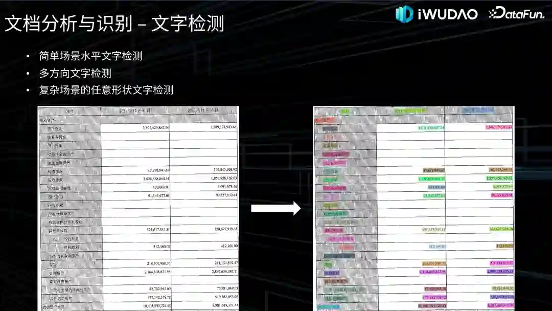 另外一个工作是基于多模态融合的版面分析工作,通过实验我们发现 VSR 等多模态模型和基于 Mask R-CNN 等分割模型相比,视觉上相似目标区域的识别精度提升明显,如图所示,文本段落和表格附注的视觉特征很相似,加入语义信息后,版面分析的精度提升显著。3. 内容识别接下来介绍内容识别的工作,将分别介绍文本检测与识别、表格识别和图形识别。(1)文本检测与识别文本检测与识别,也是我们常说的光学字符识别(OCR),接下来我会分别介绍一下二阶段也就是先文字检测再文本识别的技术以及端到端的方法。