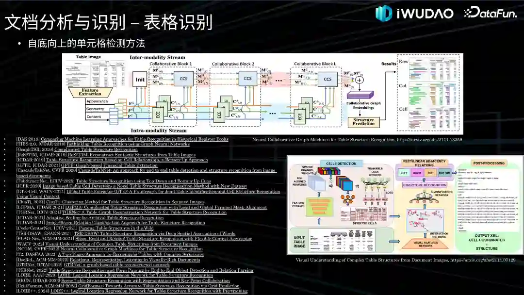 接着是自底向上的单元格检测方法,通常分为两个步骤,先检测单元格或文本块区域(语义分割、顶点检测、文本聚合等),再判断单元格或文本块关系(根据位置规则判断、GNN 边分类、多模态等)。一个较早在 2019 年提出的方法 GraphTSR 模型,将每个单元格视做一个节点,构建出全连接图,使用图网络来对每条边进行分类,判断 K 邻的单元格对是否在同一行或同一列。另一个由北交大团队在 ICDAR-2019 提出的 Res2TIM 系统,在融合得到特征后,构建单元格对来判断两个单元格的上下左右关系来重建表格。不过这两个工作都没有给出完善的单元格区域检测说明。另一个工作是来自印度的团队在 ECCV-2020 上提出的 TabStruct-Net,使用修改的 Mask R-CNN 检测单元格,FPN 和 LSTM 提取单元格的视觉特征,DGCNN 构建无向图,判断单元格对是否属于同行同列。海康威视在 ICDAR-2021 夺得比赛第一名的 LGPMA,重点优化了空白单元格对检测模型的干扰。阿里在 ICCV-2021 提出的 Cycle-CenterNet,通过同时检测单元格的中心以及 4 个单元格的交汇点来得到单元格区域。腾讯优图在 CVPR-2022 提出的 NCGM 提取几何、视觉和文本等多模态特征,判断文本行是否同行、同列、同单元格。这个分类的方法较多,已在左下角列出,就不一一介绍了。