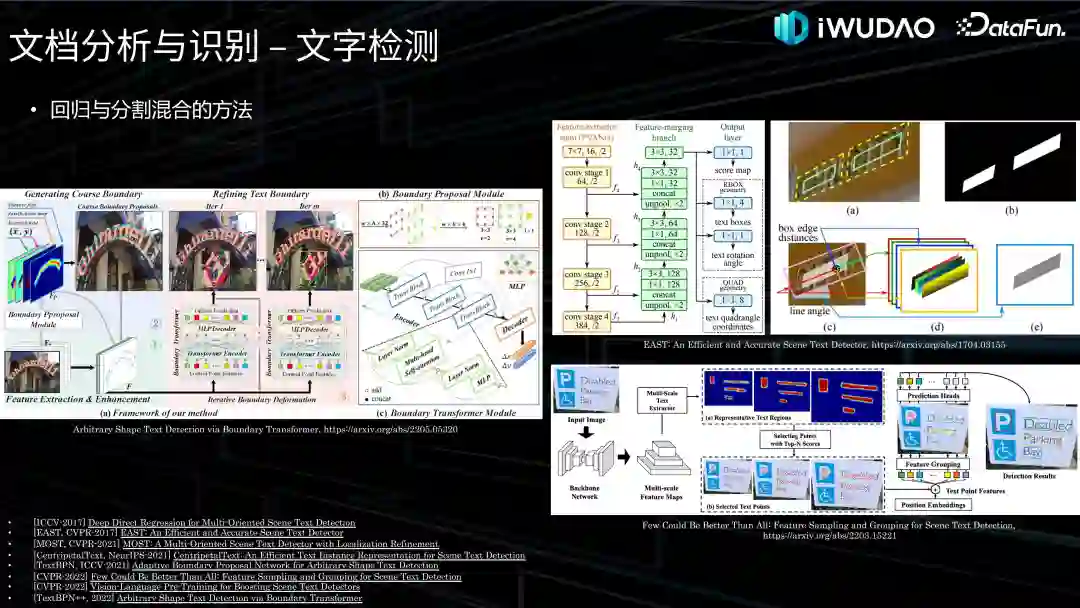 除此之外,还有混合的方法,将回归和分割融合到一起,结合两者的优势从而更精确地定位文本位置。其中最具代表性的工作是旷视在 CVPR-2017 上发表的工作 EAST 以及中科院自动化研究所刘成林老师团队在 ICCV-2017 上发表的工作,在全卷积分割网络的基础上直接得到本文区域任意四边形框,消除了中间候选框提取的过程,具有较高的效率和精度。近几年,基于 Transformer 的混合回归与分割的方法也在文本检测领域上逐步展现了潜力,例如 CVPR-2022 上阿里和网易的两篇工作在上图中列出,就不在这里展开。