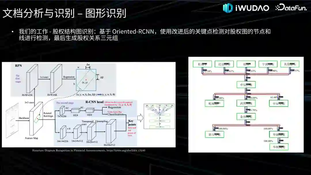 内容识别里面最重要的两个模块:OCR 和表格识别已经介绍完了,还有很多的特殊版块内容识别就不在这里一一列举了,下面简单介绍一下我们在图形识别中的一个工作:股权结构图的识别。这项工作是吾道科技和华中科技大学合作的,主要目标是从招股说明书或募集说明书中识别股权结构,以构建金融知识图谱。我们提出了一种更可靠的框图识别系统,用于股权结构图识别,能够很好识别各种场景下的复杂连线。此外,我们利用股权结构图自身的结构特点,开发实现了一套自动生成股权结构图和对应标注数据的工具。首先使用 VSR 版面分析抽取出股权结构图,然后基于 Oriented R-CNN,使用改进后的关键点检测对股权图的节点和线进行检测,最后生成股权关系三元组。实验结果显示我们提出的方法对于 Arrow R-CNN 在性能上有显著的进步,尤其是对连线的识别有巨大的改进,如果有兴趣可以到 arxiv 查看我们的论文。04****