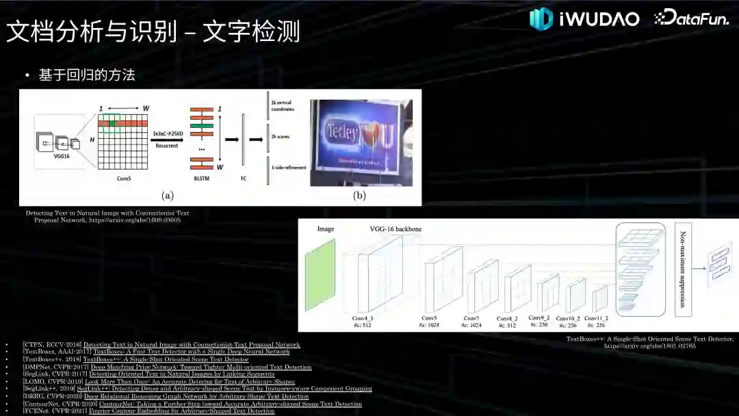 首先讲一下基于回归的方法:基于回归的方法与通用目标检测类似,需要回归预测文本包围框的顶点坐标位置。然而,由于文本往往存在多方向、任意形变以及极端长宽比变化等特点,现有的通用目标检测框架难以直接用于处理文本检测,为此提出了一些有针对性的方法。一个比较著名的早期工作是 ECCV-2016 上发表的工作 CTPN,如左上角所示,将图像空间划分为多个小块,再使用循环神经网络去分析小块的上下文连接关系。CTPN 对于长文本检测具有稳定的效果,但只能处理近似水平的文本。右下角所示的 AAAI-2017 上发表的工作 TextBoxes 系列设计了一系列具有不同长宽比的锚点和卷积核来适应文本的长宽比变化,通过多任务学习来同时预测文本的水平框和四边形框。为了针对任意方向的文本进行检测,SegLink 系列和 DRRG 都是直接回归获得文本单元以及关系。为了更好地拟合不规则文本的轮廓,一些方法采用基于曲线拟合的方法来拟合文本的形状,比如 CVPR-2021 上的基于傅里叶曲线的 FCENet 等,就不在这里一一赘述。