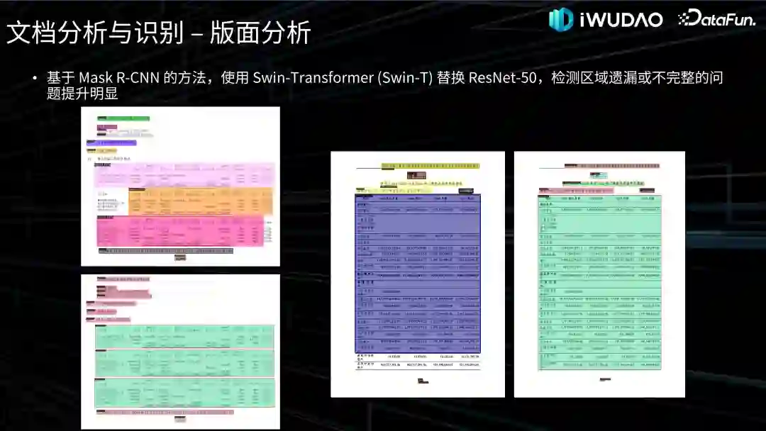下面介绍一下我们在版面分析的一些实验工作,在使用 Mask R-CNN 框架的模型中,我们把传统的 CNN BackBone 替换为 ViT BackBone,比如这边我们用差不多参数量的 Swin-T 替换 ResNet-50,发现精度提升明显,尤其是检测目标不完整或遗漏的情况得以缓解。