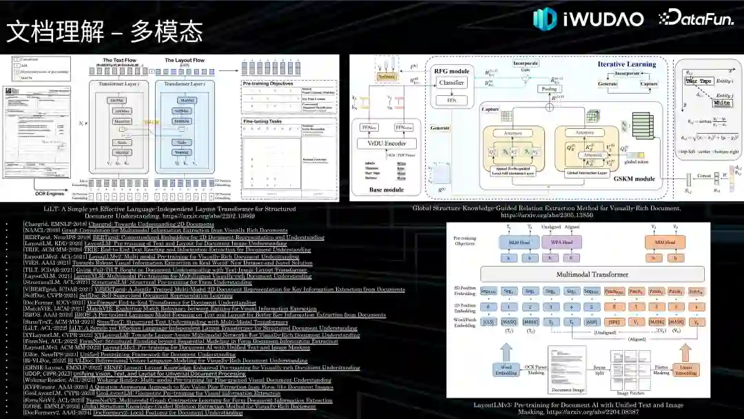 多模态文档理解的一个常见的工作范式:图像经过 OCR 获取到文本,图像通过视觉的 BackBone 获得视觉特征,然后做特征融合送进 Transformer Encoder 去获取融合之后的特征,然后去做后续的预训练任务,每个模型的预训练任务都是不一样的,做完预训练后再去做下游的微调任务。基于这个范式会有很多优化工作,比如 LayoutLM 系列,右下角这张是微软亚洲在 ACM-MM-2022 发表的 LayoutLMv3,他的做法是对图像做成 patch embedding 来和文本拼接,省去了 LayoutLMv2 中 CNN BackBone 的计算量,然后直接把 Transformer Encoder 当做一个 ViT 做融合学习。然后左上角这个图是一个比较有特点的模型,是华南理工金连文老师团队在 ACL-2022 发表的 LiLT,LiLT 是双塔结构,把 text flow 和 layout flow 分开了,可以进行灵活的替换 text 或 layout,并且 LiLT 是纯文本输入,没有图像作为输入也可以达到一个很好的效果,甚至比 LayoutLMv2 还要好。此外还有百度在 ACM-MM-2021 发表的 StructTexT、蚂蚁在 CVPR-2022 的工作 XYLayoutLM、Google 在 ACL-2022 的工作 FormNet 系列、微软亚洲在 AAAI-2023 的工作 KVPFormer、阿里在 CVPR-2023 的工作 GeoLayoutLM 以及发表在 EMNLP-2023 针对关系抽取任务做优化的 GOSE,如右上角图片所示,时间关系就不在这里展开介绍了。