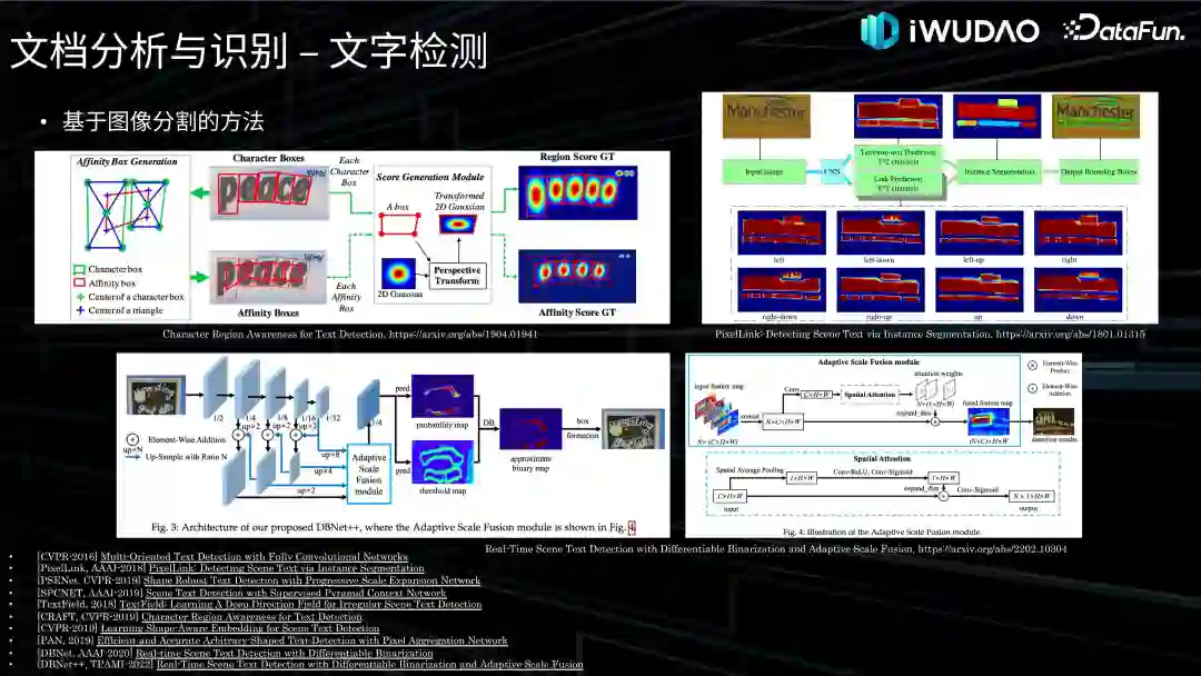 再来介绍一下基于图像分割的方法。基于图像分割的方法能够提供像素级的检测结果,可适应文本的任意形状。基于图像分割的场景文本检测通常可以看做是二分类分割任务,旨在精确分离文本和背景。由于分割方法只能提供一个像素级的预测概率,这类方法通常需要后处理操作以获取精准的文本检测结果。华科白翔老师的团队在 CVPR-2016 首次提出用全卷积网络 FCN 检测文本行,实现了多方向场景文本检测。AAAI-2018 上的工作 PixelLink,在预测文本像素的同时,预测了像素间的文本连接关系,对于分割后处理提供了更丰富的信息。此后的代表性分割方法大多致力于设计信息更丰富的分割网络,这有利于后处理过程能够获得更加准确的文本区域。比如同在 CVPR-2019 上的文章 PSENet 和 Naver 的 CRAFT。虽然基于分割的文本检测能够适应文本形状的多样性,但其后处理过程往往带来了更多的时间消耗。为了简化后处理的过程,华科白翔老师团队在 AAAI-2020 上的工作 DBNet 提出了一个可微的二值化网络模块,该模块可以与分割网络一同进行优化,并使模型自适应地选择所有位置所需的二值化阈值。联合优化的过程不仅提升了检测的性能,而且简化了后处理的操作,在场景文本检测任务的速度和精度方面取得了理想的平衡。DBNet 后来被著名的开源项目 PaddleOCR 选做检测算法,且在 OpenCV 和微信 OCR 中被使用,是一个应用广泛的文字检测算法。
