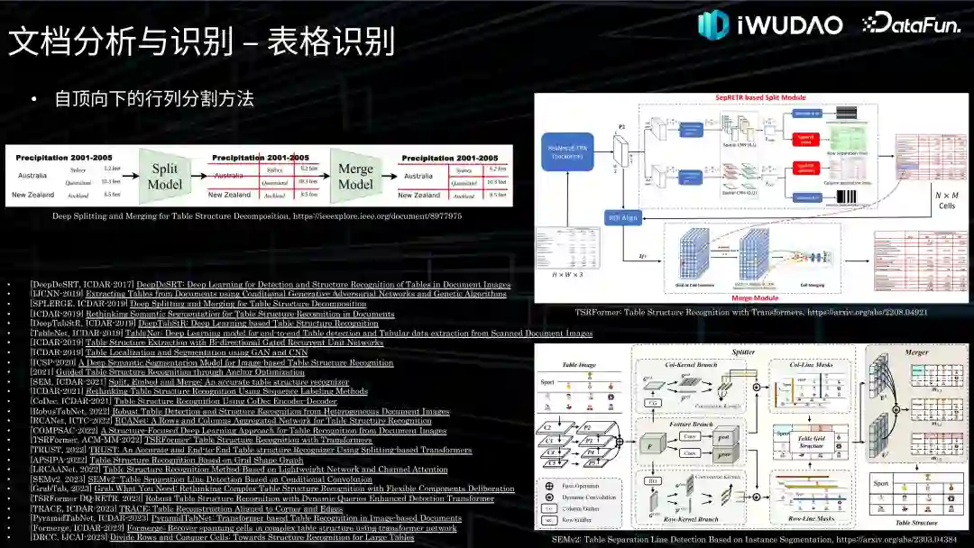 首先是自顶向下的行列分割方法,是较早开始研究的基于深度学习的方法。通常分为两个步骤,第一步是将表格分割成网格单元(语义分割或目标检测获得分割交点、行列像素分类)。第二步是判断网格关系(规则判断、CNN 或多模态相邻网格二分类、GNN 边分类、基于网格单元的 RNN/Transformer)。当然早期很多工作没考虑网格关系判断,因此无法处理有合并单元格的表格,只能处理简单二维表格。第一个比较完善的方法是 Adobe 在 ICDAR-2019 上发表的工作 SPLERGE,对表格的行列分割和分割后的合并都进行了详细的讨论,提出了一个合并网络,将表格分割为最细粒度的基本单元,然后进行合并得到真正的表格结构。随后国内在表格识别领域逐渐兴起并逐渐处于较为领先的水平,中科大团队在 ICDAR-2021 提出的 SEM 在会议举办的比赛中获得复杂表格识别的第一名,采用 ResNet-34 + FPN 做行列分割,复用分割网络的视觉特征 + Bert 提取的语义信息作为网格特征,采用 GRU 处理网格合并,而在 2023 年更新的 SEMv2 中,用 Transformer 获取网格单元的依赖关系来处理单元格的合并。另外一个微软亚洲的工作 TSRFormer 在使用 ResNet-18 + FPN + Spatial CNN 提取特征后,采用基于 Transformer 的 Decoder 分割行列,然后通过 Grid CNN 判断相邻网格是否需要合并。