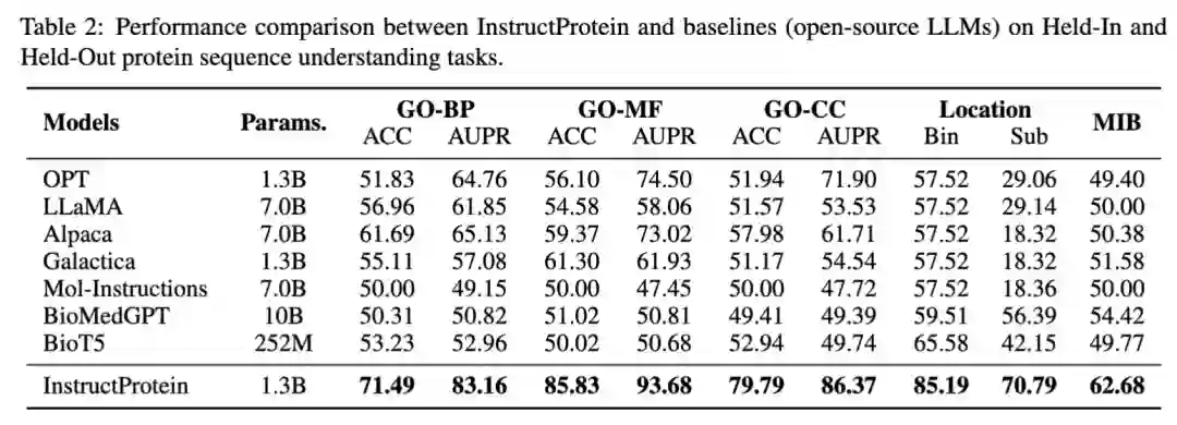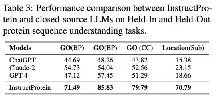 在蛋白质理解方面,本文评估了模型在以下三个分类任务上的性能:蛋白质位置预测、蛋白质功能预测 (基于Gene Ontology分类)、蛋白质金属离子结合能力预测。这些任务被设计成类似于自然语言中的阅读理解问题,其中每条数据包含一条蛋白质序列及一个问题,模型需回答是/否类型的问题。 在蛋白质序列理解和分类任务上,InstructProtein展示了优异的表现,超越了所有基线模型。研究指出,将蛋白质和自然语言结合的训练语料库有利于提高语言模型在蛋白质语言理解方面的能力。特别值得注意的是,InstructProtein在多种任务(包括指令数据集中见过的和没见过的任务)上显示出较强的泛化能力,而其他模型如Mol-Instructions因模板不足而未能有效理解任务需求。此外,封闭源模型(如ChatGPT等)也显示出在蛋白质位置预测任务中受到注释不平衡的影响,这进一步强调了优质指令数据集的重要性。值得注意的是,在蛋白质位置预测(Bin)任务中的奇怪结果是因为现存的大语言模型受到注释不平衡的影响将所有蛋白质分类为单一组