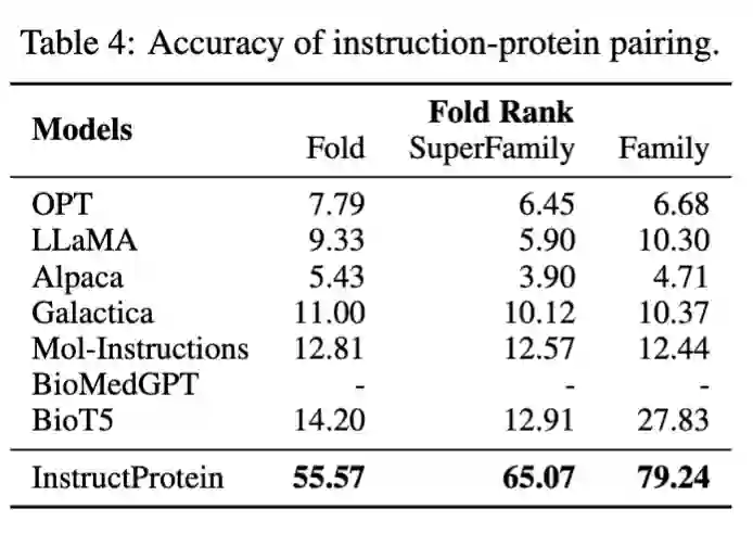在蛋白质设计方面,文章设计了一个“指令蛋白配对”任务:给定一个蛋白质及其描述,模型需要从其对应描述及九个不对应的描述中选择最合适的一项。在指令-蛋白质配对任务中,InstructProtein显著超越了所有基线模型,展现出其在指令跟随和蛋白质设计方面的优越性。BioMedGPT因只专注于将蛋白质转换为文本而缺乏蛋白质设计能力。Galactica由于其训练数据集是以叙述性蛋白质语料为主,因此在零样本任务中与指令对齐的性能有限。Mol-Instructions没有在蛋白质语料上进行预训练,难以分辨蛋白质的细微差异,导致性能不佳。这些结果验证了我们模型在遵循设计指令方面的出色能力,强调了针对特定任务进行预训练和数据集优化的重要性,以提升模型在蛋白质设计方面的性能。