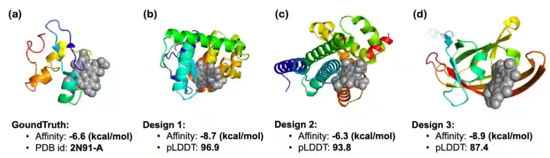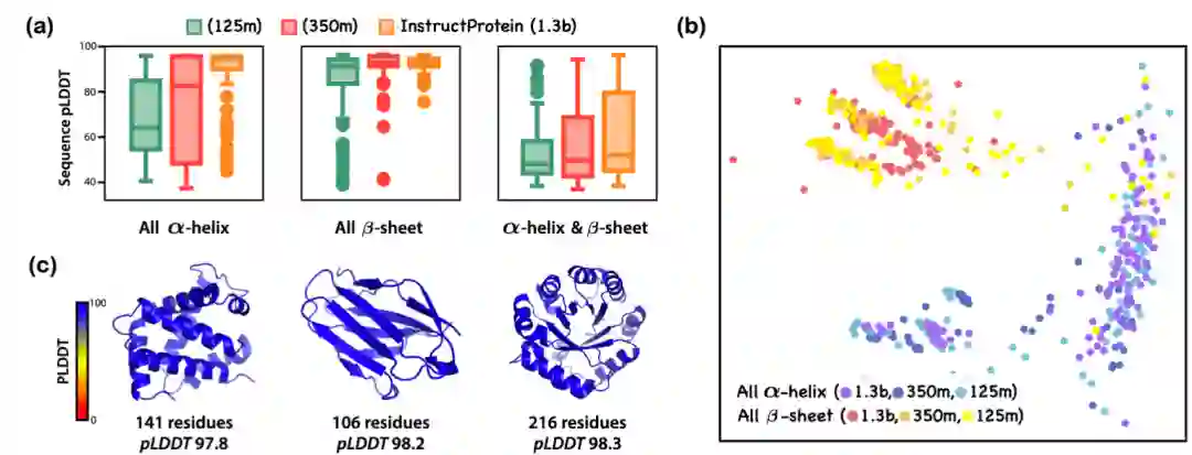 文章还探讨了结构相关指令和功能相关指令的蛋白质生成:InstructProtein 的研究展示了其在依据结构相关指令生成新蛋白质序列方面的有效性。通过使用 SCOPe 分类和 ColabFold 预测每个蛋白质序列的可折叠性,结果显示模型规模的增加能够产生更少内在无序区域的蛋白质。此外,通过 ESM2 和多维缩放算法对生成的全-螺旋和全-折叠蛋白质进行可视化,证明了模型遵循指令的能力。在功能相关的设计中,InstructProtein 成功设计了与血红素结合的蛋白质,其结合亲和力和结构预测评分均表明了良好的设计性能。结合 HHblits 对同源性的检查也显示了序列的新颖性。这些结果表明 InstructProtein 在基于自然语言的蛋白质设计中具有高效且创新的潜力。