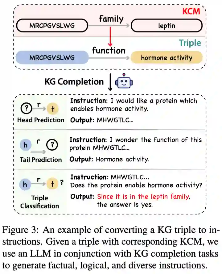 本文提出了一种名为“知识指令”的数据构建方法,这一方法通过利用知识图谱和大语言模型的协同工作,以构建一个平衡且多样化的指令数据集。该方法的核心在于,它不依赖于大语言模型对蛋白质语言的理解能力,从而避免了因模型偏误或幻觉而引入的虚假信息。 具体的构建过程分为三个主要阶段: