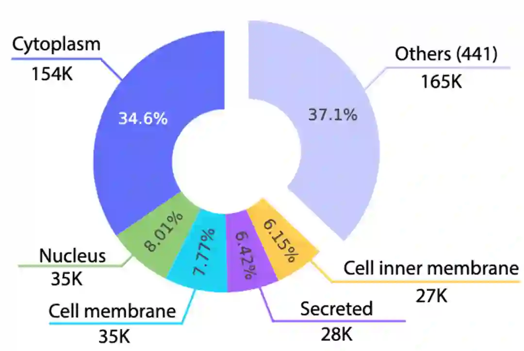 在子细胞器位置分类的研究中,我们面临着一个数据不均衡的问题。具体来说,根据所描述的图表,共有446种不同的子细胞器位置分类。其中,注释数量最多的前五大分类占据了总注释量的62.9%,而有大量的分类仅出现了一次,它们各自只占总注释量的极小比例(0.000224%)。这种严重的不均衡性对大型语言模型的预测性能产生了负面影响。当我们尝试用不同的大型语言模型来预测子细胞器位置时,可以观察到,它们的预测结果也呈现出与训练数据相似的不均衡性。换句话说,模型往往倾向于预测那些在训练数据中注释量多的位置,而较少预测那些罕见的位置。
