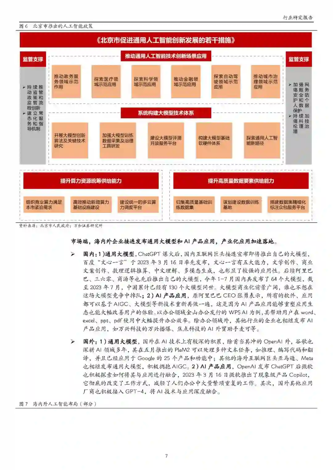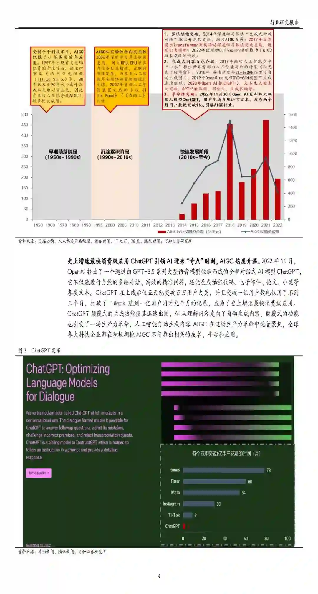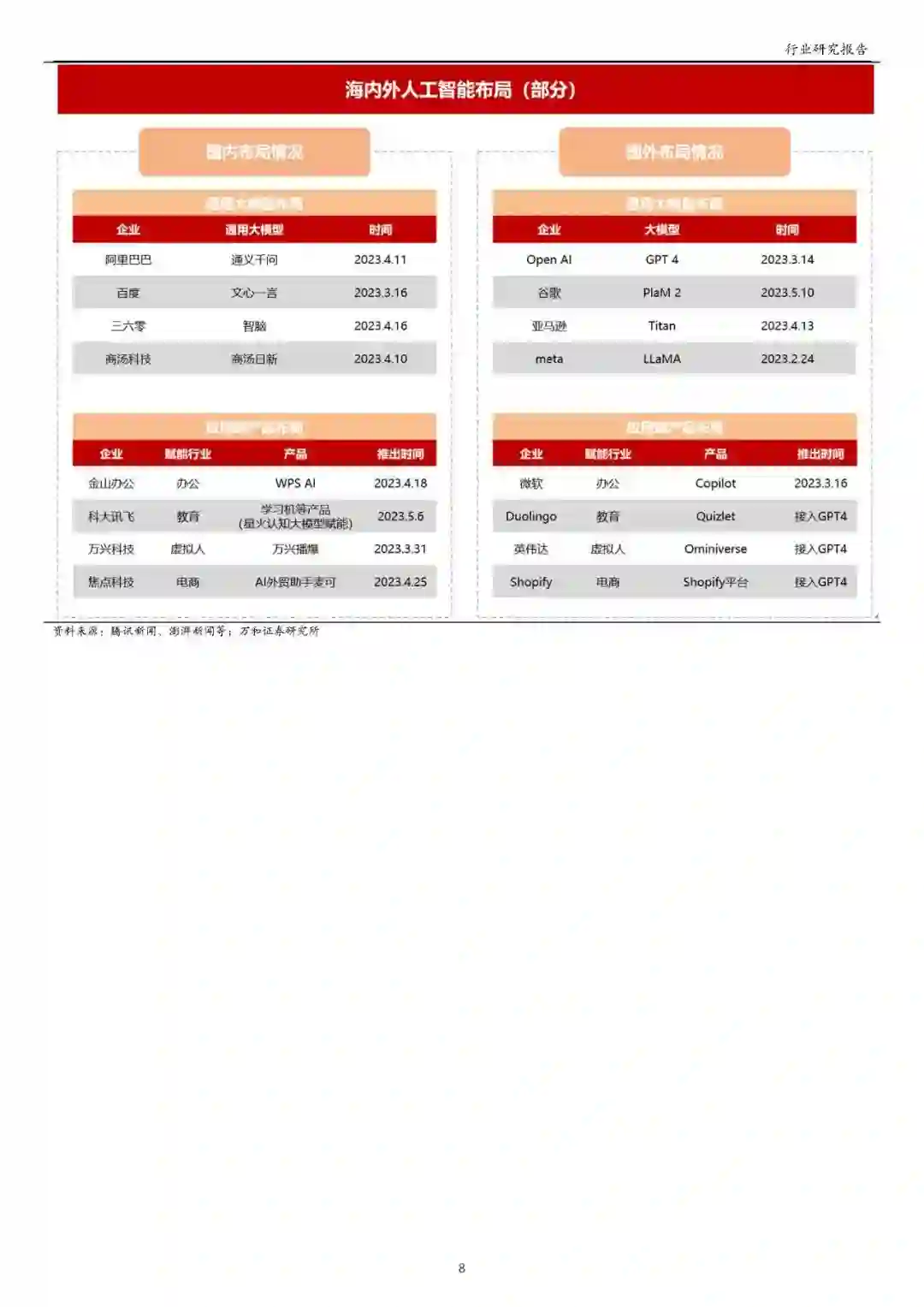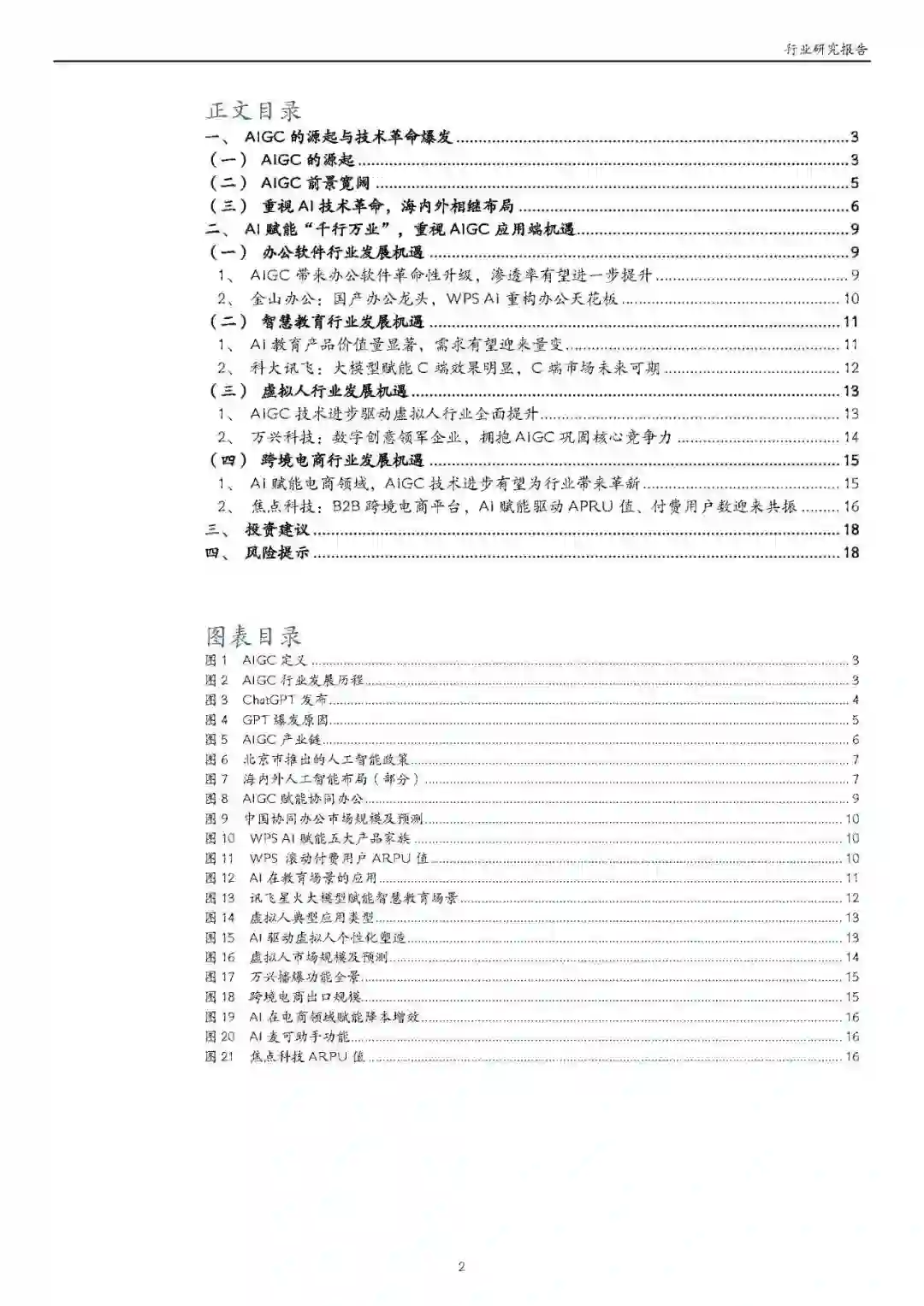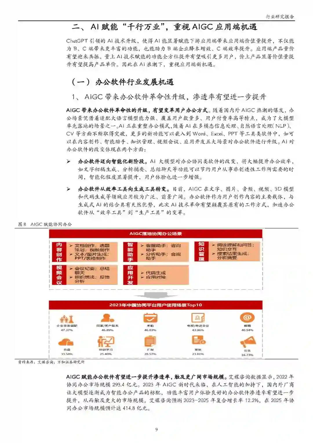 AIGC前景道路宽阔,海内外相继布局。Open AI2022年11月推出ChatGPT,突破一亿用户仅用不到三个月,引领AI迎来“奇点”时刻,其颠覆式的生成能力带来一场技术革命。此次AIGC概念火热的底层逻辑主要是技术端取得突破性进展及商业模式上大模型使用性价比显著提升,具备广阔商业化前景,海内外也相继进行布局。 AI赋能“千行万业”,重视AIGC应用端机遇。AI浪潮下,重视AIGC应用端新机遇,办公、教育、虚拟人、电商四个行业深度受益AI赋能: 办公:办公场景凭借着适配大语言模型能力强、覆盖用户数量多、用户付费率高等特点,成为了大模型率先落地的场景之一。接入大模型的办公软件产品力提升,其有望进一步提升渗透率触及更广阔的市场规模,未来能为办公软件公司带来明显业绩提升。办公行业代表企业金山办公长期深耕AI赋能产品,于今年上半年推出WPSAI,并嵌入旗下金山文档、演示等多个产品。金山办公产品矩阵有望在AI赋能下深度受益,打开B、C端空间。 教育:AI赋能智慧教育应用场景广阔,不仅能为学生提供个性化教育,对于教师也能够解放更多时间去进行更高质量的教育,学校端则也能显著降本增效并且建设更好的校园环境。随着ChatGPT引领着AI技术升级,AI教育产品具备更强的价值量,智慧教育课堂、学习机等AI教育产品渗透率有望持续提升,教育领域代表产品讯飞学习机搭载了科大讯飞发布的讯飞星火1.5大模型,讯飞AI学习机GMV在5月和6月分别增长136%和217%,科大讯飞也有望通过AI产品打开C端空间。 虚拟人:AIGC技术进步使得数字虚拟人主要在制作、应用、价值三方面受益,制作上AIGC的技术进步提升了AI数字人制作效率,制作门槛降低,应用上大模型多模态生成能力提升了虚拟人交互能力,真人替代能力提升,价值上AI赋能虚拟人越来越“聪明”,可以具备更强的创造力。虚拟人行业实现了向更高阶段迈进,未来行业规模也将保持持续增长。万兴科技新开发的“万兴播爆”不仅能借虚拟数字人技术让生产周期较长的视频变成源源不断产出的“工业品”,为用户提供了创新高效的出海营销口播短视频制作工具,也能帮助用户降本增效,价值量明显。万兴科技也有望通过新推出的“万兴播爆”为公司打开第二增长曲线。 电商:电商AI赋能电商领域价值量明显,不仅能够为企业降本增效,还能通过促进下单转化率实现创收,AIGC技术进步有望为行业带来革新。B2B跨境电商龙头企业焦点科技于今年推出外贸助手“麦可”,能够有效帮助客户降本增效,为客户赋能,有望提升公司ARPU值。
