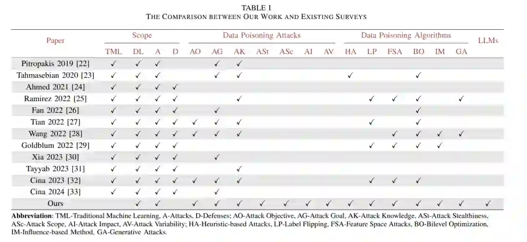表I通过关键维度对比凸显了本工作的独特性:现有综述虽覆盖广泛的对抗攻防主题,但缺乏对投毒技术的细粒度分类,亦未涉及LLMs投毒;而本文不仅提出投毒攻击与算法的深度分类体系,更将讨论延伸至LLMs这一新兴领域。