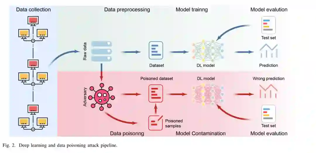 摘要——深度学习已成为现代人工智能的基石,推动着众多领域的变革性应用。作为深度学习的核心要素,训练数据的质量与安全性深刻影响着模型的性能与可靠性。然而在训练过程中,深度学习模型面临着数据投毒这一重大威胁——攻击者通过注入恶意篡改的训练数据,导致模型精度下降或行为异常。尽管现有综述对数据投毒问题提供了宝贵见解,但大多采取宽泛视角统览攻防技术,缺乏针对深度学习场景下投毒攻击的专项深入分析。本文填补了这一空白,系统性地综述了深度学习中的数据投毒研究:首先从多维度对投毒攻击进行分类,深入剖析其技术特征与设计原理;其次将讨论延伸至**大语言模型(LLMs)**这一新兴领域的数据投毒问题;最后探讨了该领域的关键开放挑战,并提出推动学科发展的潜在研究方向。为促进后续探索,我们在https://github.com/Pinlong-Zhao/Data-Poisoning 维护了深度学习数据投毒研究的最新资源库。