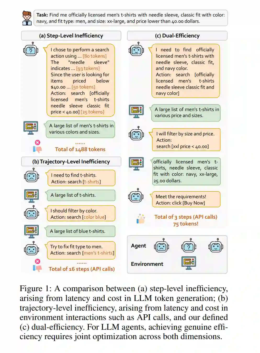 大型语言模型(LLMs)在长上下文推理(Bai et al. 2024)、代码生成(Zhuo et al. 2025)以及数学推理(Luo et al. 2025b)等复杂任务上表现出令人瞩目的能力。为了让这些能力更加贴近真实应用,近期研究开始探索 LLM 智能体(LLM agents),旨在构建能够执行任务规划、工具使用,并与动态环境进行多轮交互的自主系统(Shi et al. 2024; Song et al. 2024; Chen et al. 2024; Zeng et al. 2024; Yuan et al. 2025; Fu et al. 2025; Wang et al. 2025c; Feng et al. 2025a)。随着更先进的模型追求更高的推理准确性,其思维链(CoT, Wei et al. 2022; Zhao et al. 2025)往往变得更长,导致响应延迟增加、执行效率降低。效率对于将 LLM 智能体从原型推进至实际应用至关重要,因为缓慢的响应时间是阻碍真实部署的一大障碍。然而,提高速度不能以牺牲准确性为代价——一个快速但不可靠的智能体是无用的,甚至具有危害性。因此,我们在保持推理质量的前提下寻求提升响应效率。 当前关于 LLM 效率的讨论主要集中于减少生成的 token 数量(Wang et al. 2025a; Qu et al. 2025; Feng et al. 2025b)。然而,这一视角忽视了 LLM 智能体的交互动态特性。在实践中,智能体通常需要在每个决策步骤执行 API 调用或访问 Web 服务,其延迟和成本更多取决于步骤数量而非仅仅 token 数量。因此,我们首先从两个关键维度定义了 LLM 智能体的效率,即我们称之为双重效率(dual-efficiency): 1. 步骤级效率(step-level efficiency):旨在最小化每个交互步骤生成的 token 数,促进回答更简洁。 1. 轨迹级效率(trajectory-level efficiency):旨在最小化完成任务所需的总交互步骤数量。