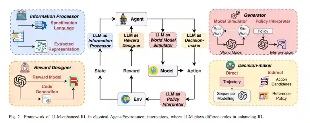 尽管将LLMs整合到RL范式中的领域取得了进步,但在这一迅速发展的领域目前显著缺乏全面综述。此外,尽管提出了各种方法将LLMs整合到RL范式中,但还没有统一的框架进行这种整合。我们的综述旨在填补这些空白,通过提供相关文献的广泛回顾,定义名为LLM增强RL的新范式的范围,并进一步提出一个分类法来对LLMs在所提范式中的功能进行分类。