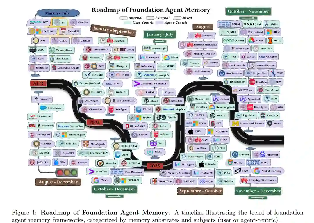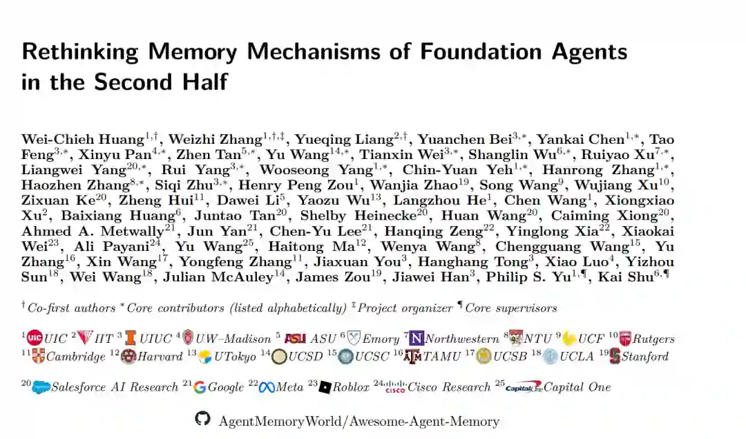 人工智能研究正经历一场范式转移:从优先考虑模型创新与基准测试(Benchmarks)分数,转向强调问题定义与严谨的现实世界评估。随着该领域进入“下半场”,核心挑战转变为在长程(Long-horizon)、动态且依赖用户的环境中实现真正的效用。在这些环境中,智能体(Agents)面临着“上下文爆炸”的挑战,必须在长期的交互过程中持续积累、管理并选择性地重用海量信息。因此,记忆机制——今年已有数百篇相关论文发表——成为填补这一效用鸿沟的关键解决方案。 在本综述中,我们从三个维度提供了基础代理记忆的统一视角:记忆基质(内部与外部)、认知机制(情节性、语义性、感觉性、工作性和程序性记忆)以及记忆主体(以智能体为中心与以用户为中心)。随后,我们分析了在不同代理拓扑结构下,记忆是如何实例化与运行的,并重点阐述了针对记忆操作的学习策略。最后,我们梳理了评估记忆效用的基准测试与指标,并总结了当前面临的各种公开挑战与未来发展方向。