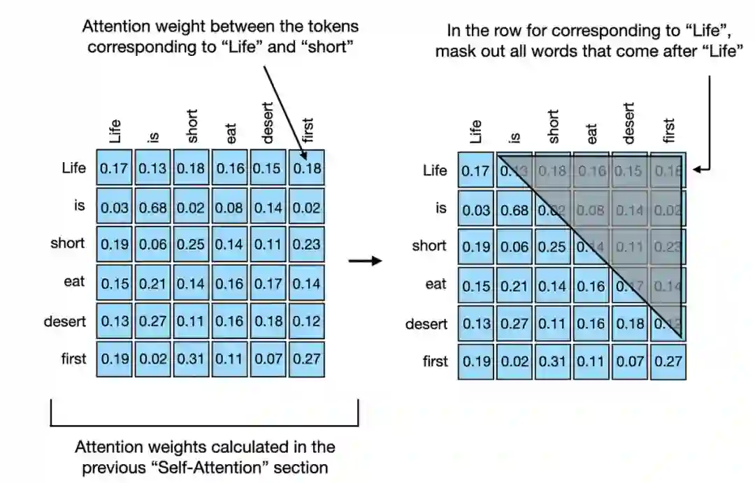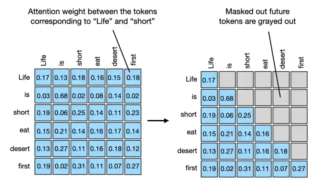 现在,在类似 GPT 的 LLM 中,我们训练模型从左至右一次阅读和生成一个 token(词)。如果我们的训练文本样本是「Life is short eat desert first」,我们有以下设置,其中箭头右侧的词的上下文向量应该只包含其自身和前面的词: