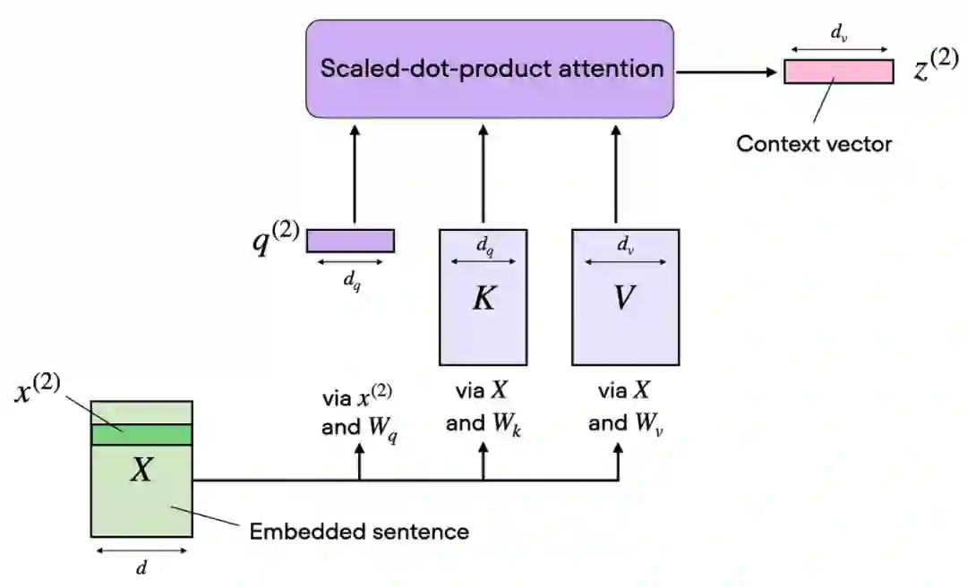 自注意力使用了三个权重矩阵,分别记为 W_q、W_k 和 W_v;它们作为模型参数,会在训练过程中不断调整。这些矩阵的作用是将输入分别投射成序列的查询、键和值分量。