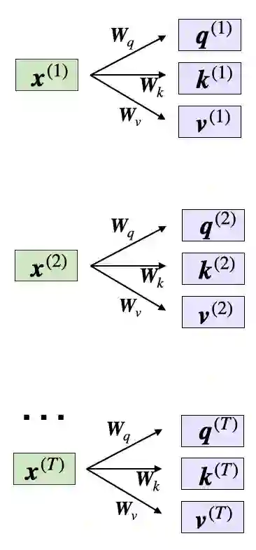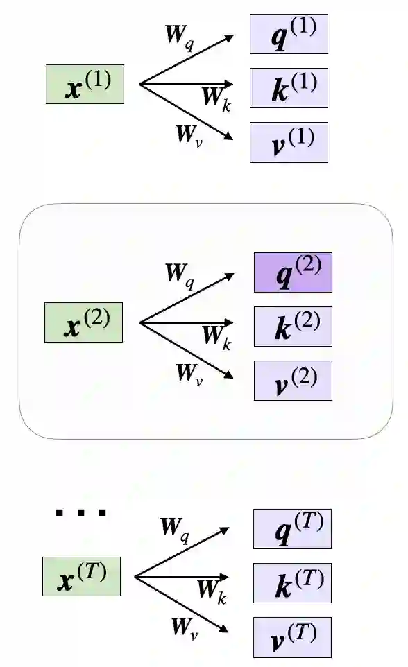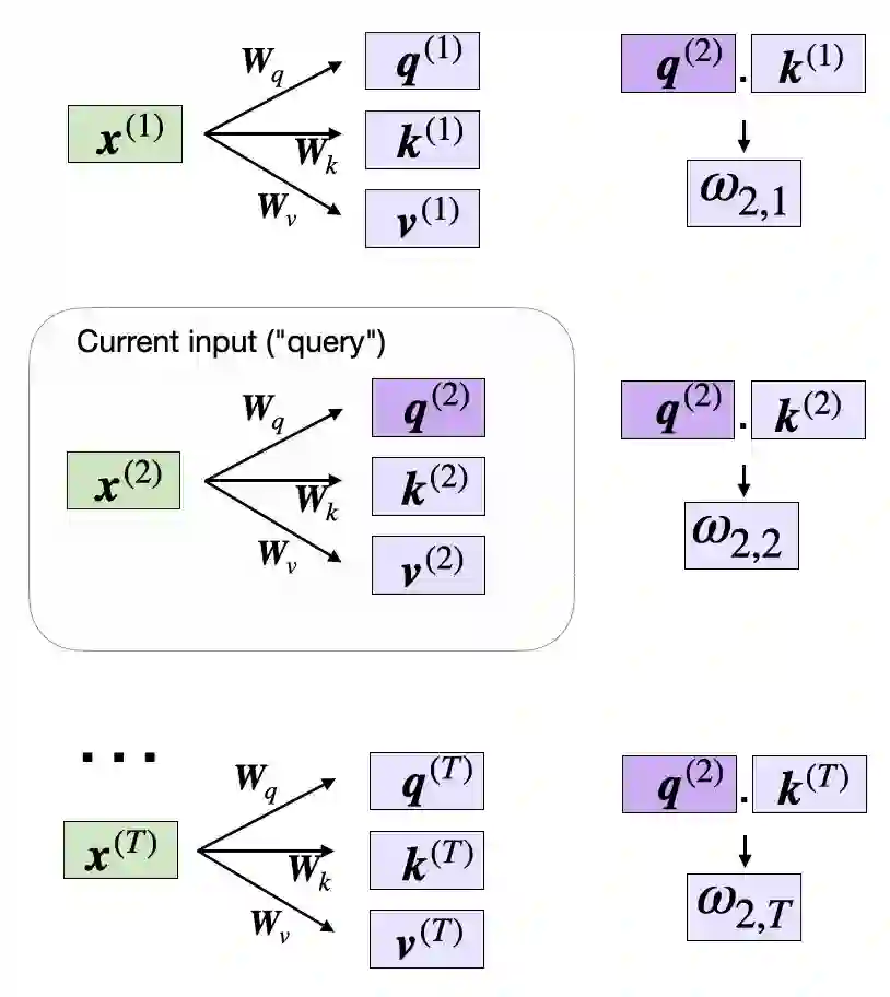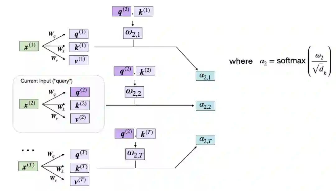 查询序列:对于属于序列 1……T 的 i,有 q⁽ⁱ⁾=x⁽ⁱ⁾W_q * 键序列:对于属于序列 1……T 的 i,有 k⁽ⁱ⁾=x⁽ⁱ⁾W_k * 值序列:对于属于序列 1……T 的 i,有 v⁽ⁱ⁾=x⁽ⁱ⁾W_v * 索引 i 是指输入序列中的 token 索引位置,其长度为 T。