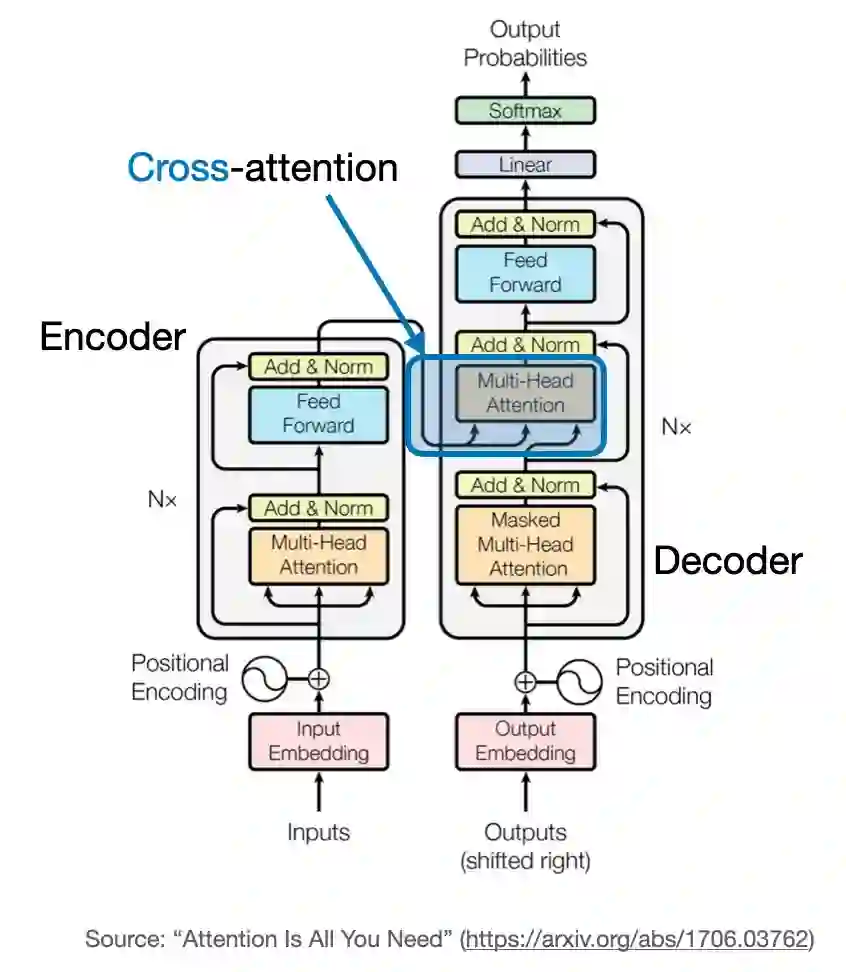 上图对应于 Transformer 中使用的自注意力机制。对于这种注意力机制,还有一点尚未讨论:交叉注意力。