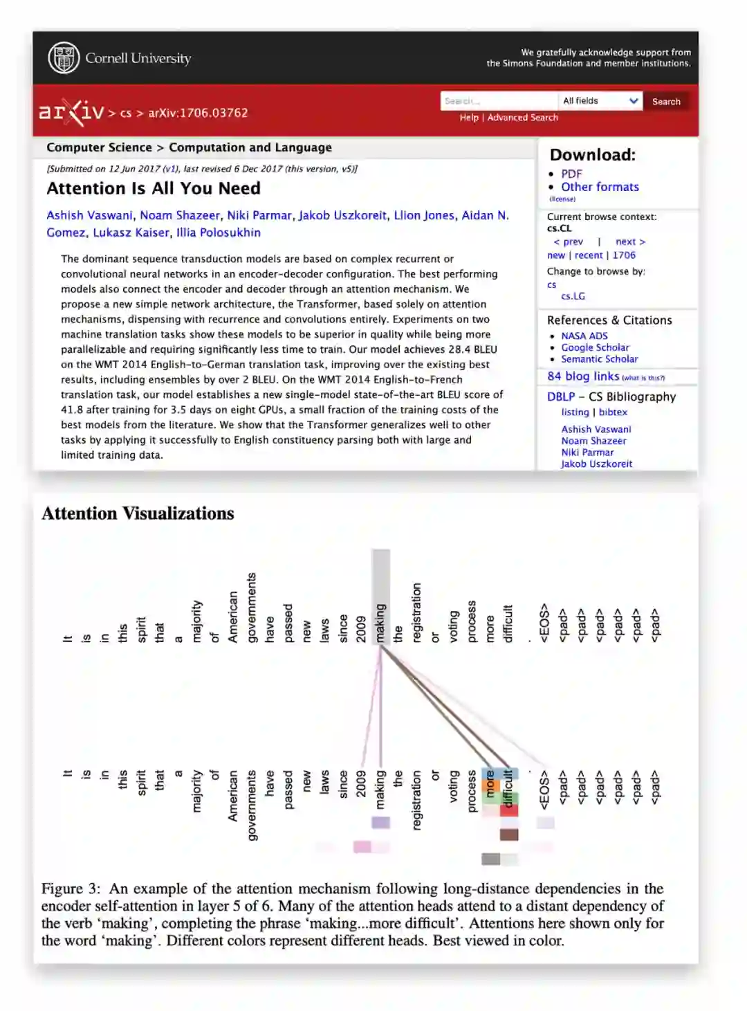 来自论文《Attention is All You Need》的插图,展示了 making 这个词对其它词的依赖或关注程度,其中的颜色代表注意力权重的差异。