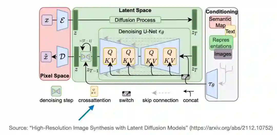 另一个使用了交叉注意力的常见模型是 Stable Diffusion。正如提出了 Stable Diffusion 模型的原论文《High-Resolution Image Synthesis with Latent Diffusion Models》中描述的那样,Stable Diffusion 在 U-Net 生成的图像和用于设定条件的文本 prompt 之间使用了交叉注意力。