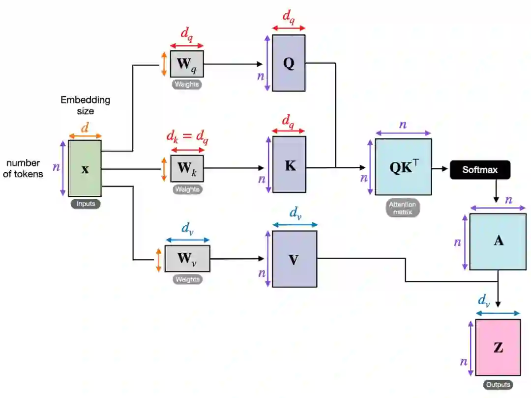 这里,q⁽ⁱ⁾ 和 k⁽ⁱ⁾ 都是维度为 d_k 的向量。投射矩阵 W_q 和 W_k 的形状为 d × d_k,而 W_v 的形状是 d × d_v。