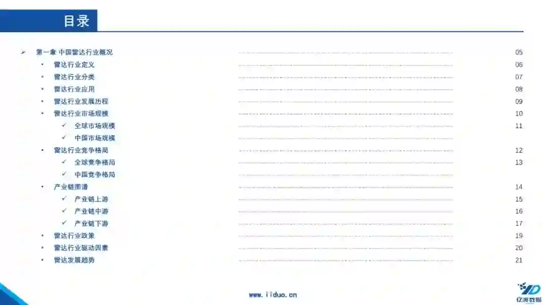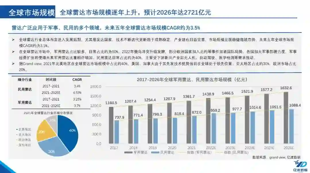 我国雷达技术和产品发展总体来说,大致经历了修配、仿制、自行设计和发展提高四个阶段,当前进入高速发展时期,该阶段的目标是赶上和缩小与世界先进雷达技术的差距。 全球雷达市场规模逐年上升,预计2026年达2721亿元,我国市场规模达783亿元。 国内雷达行业进入高速发展期,新玩家不断进入,行业竞争较为激烈。 雷达是通过无线电波来测定目标物理位置的电子设备 雷达是利用电磁波探测目标的电子设备,通过雷达发射电磁波对目标进行照射并接收其回波,由此获得目标至电磁波发射点的距离、距离变化率(径向速度)、方位、高度等信息。雷达也被称为“无线电定位”。 雷达作为利用电磁波探测目标的电子设备,具有全天候、全天时工作的特点,已经渗透应用在人类生产生活的多个领域。其不仅是军事上必不可少的电子设备,在民用市场也得到了广泛应用。
